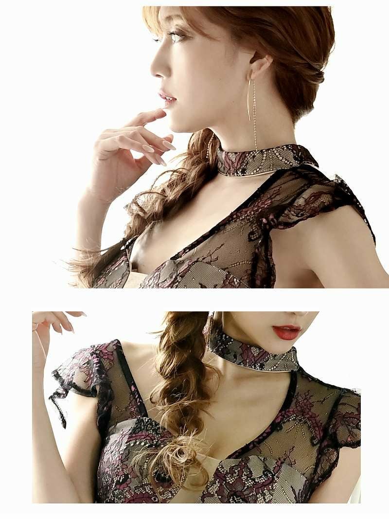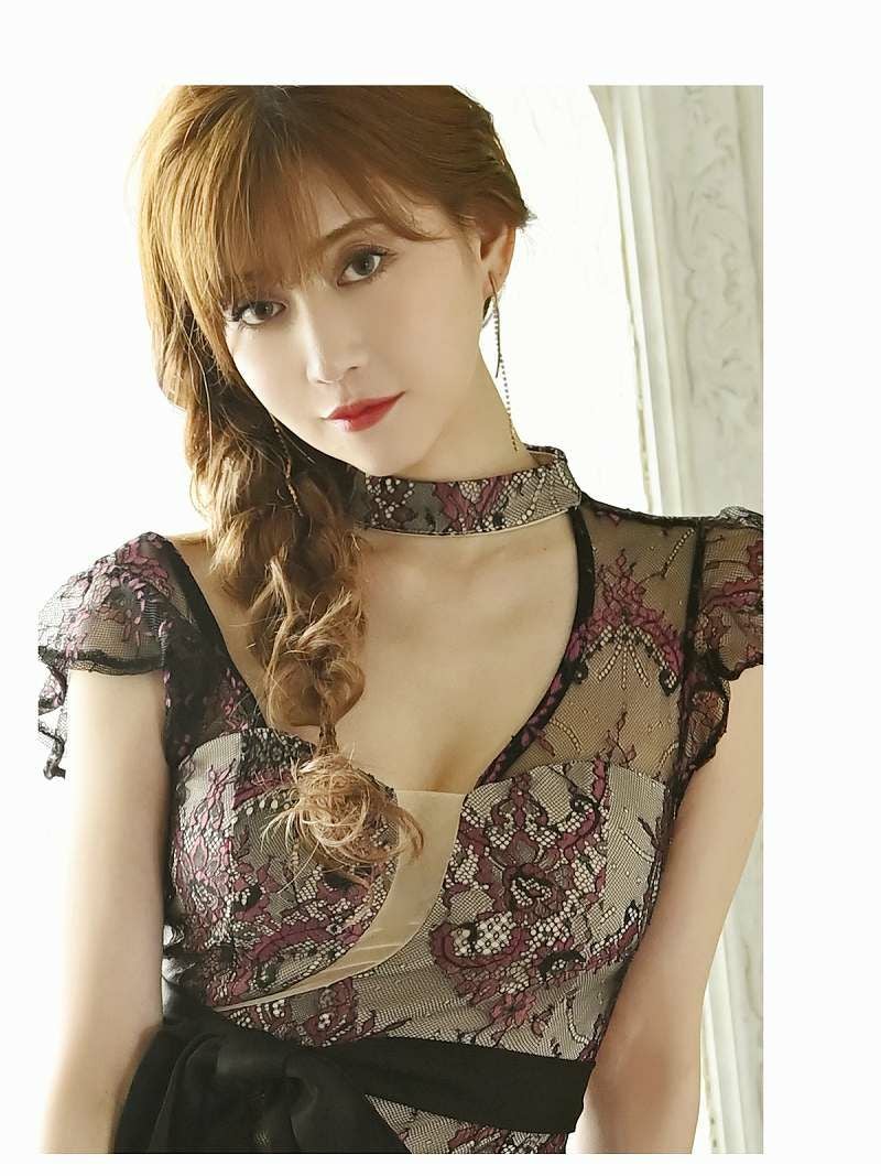 深めのバストカットでドキドキさせちゃうセクシーな谷間魅せできるチョーカー風レース袖ドレスは、しっかりとウエストマークリボンでボディラインを引き締めてスタイルアップし女性らしいシルエットを演出したキャバクラドレスです。
