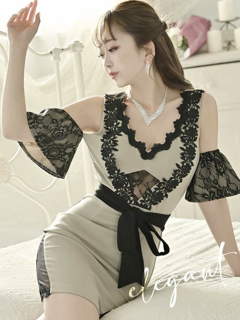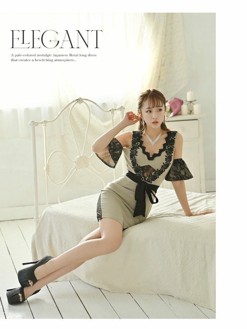 上品な色気で男を魅了♪ ウエスト透け袖ありオープンショルダーキャバドレス みりちゃむ 着用ミニドレス【Ryuyu】(S/M/L)(ブラック/グレージュ)
