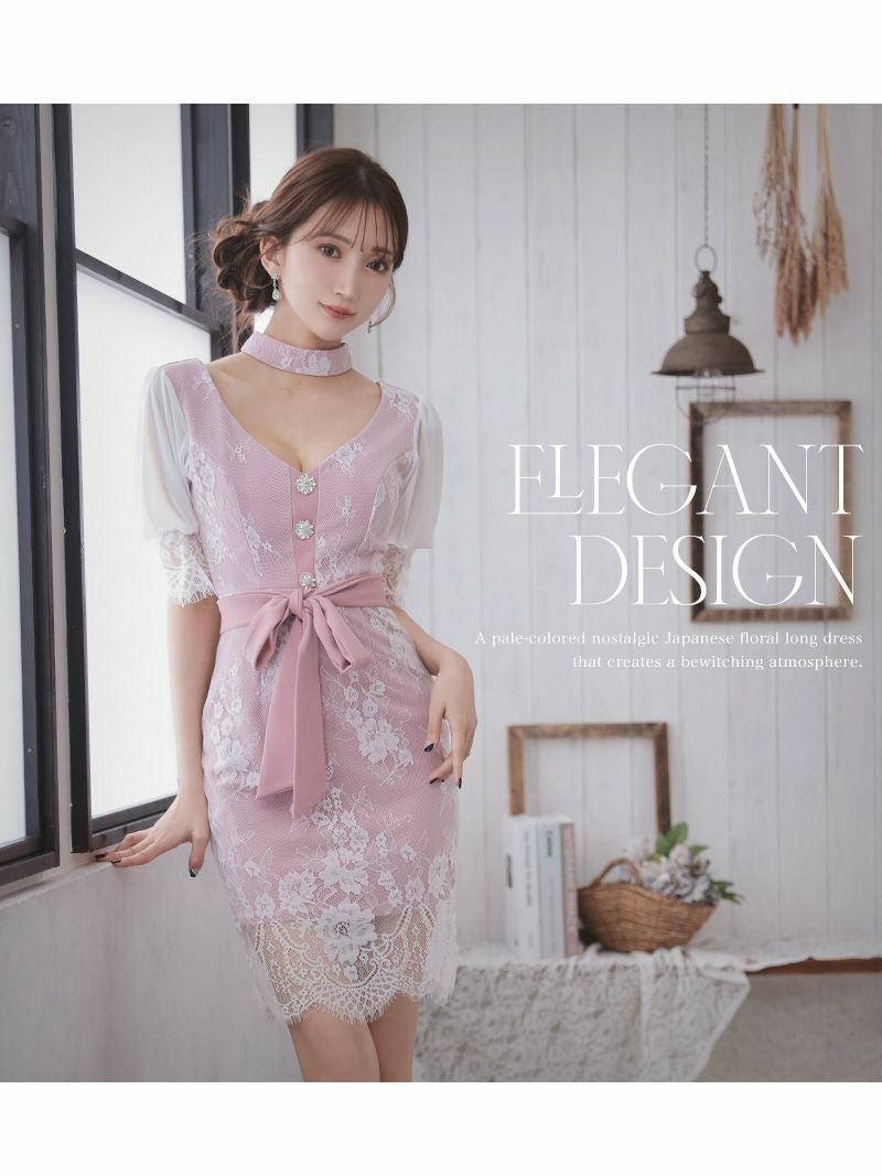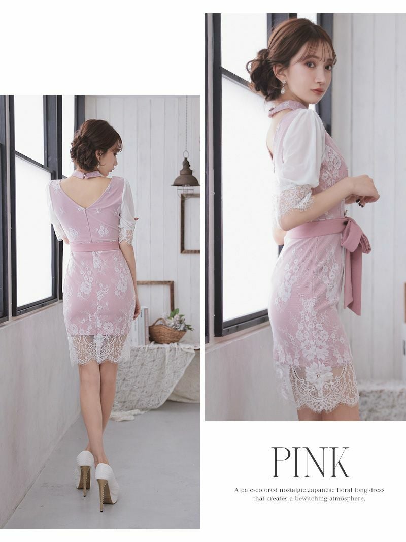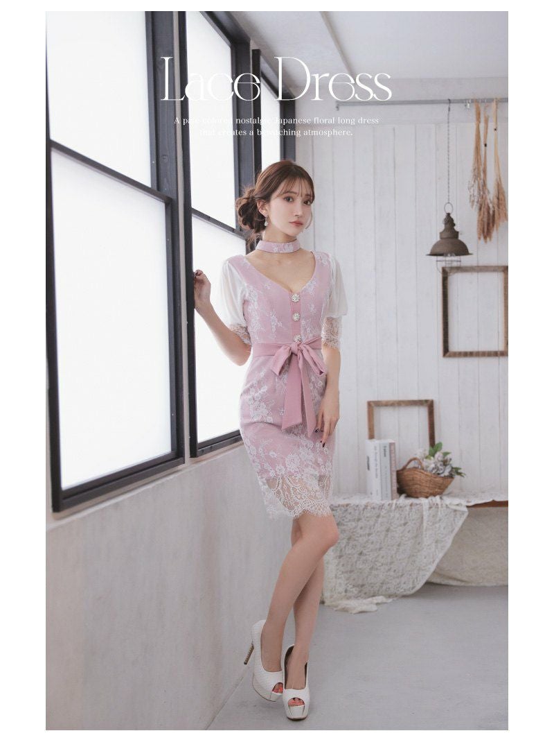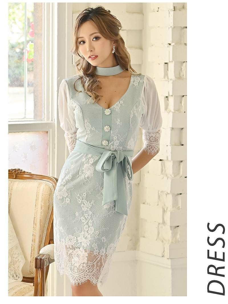 大人可愛い雰囲気を醸し出す♪ 袖付きアイラッシュレースデザインタイトキャバドレス【Ryuyu】(S/M)(ピンク/ミント)