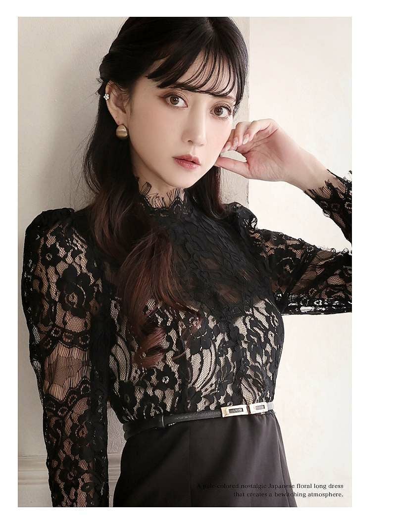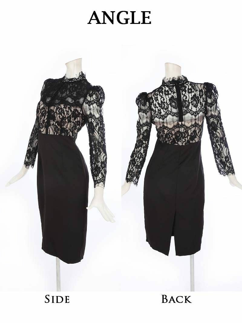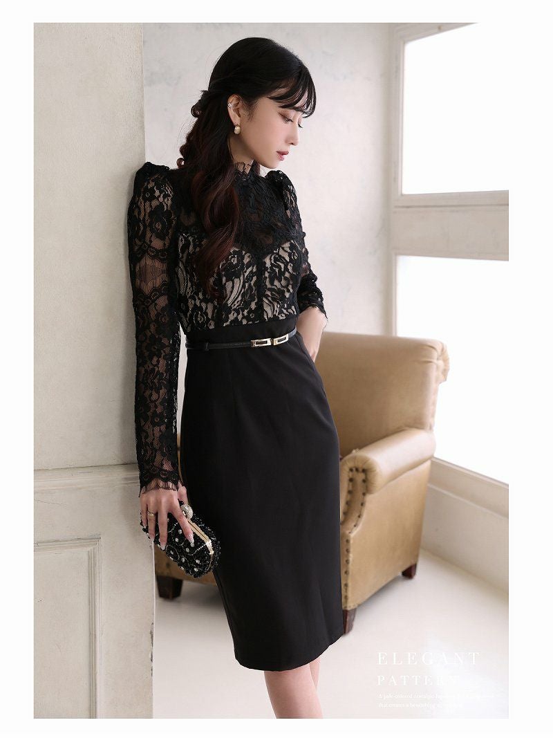 ミディ丈透けレース袖付きパーティードレス 加賀美早紀 着用キャバドレス【Belsia】