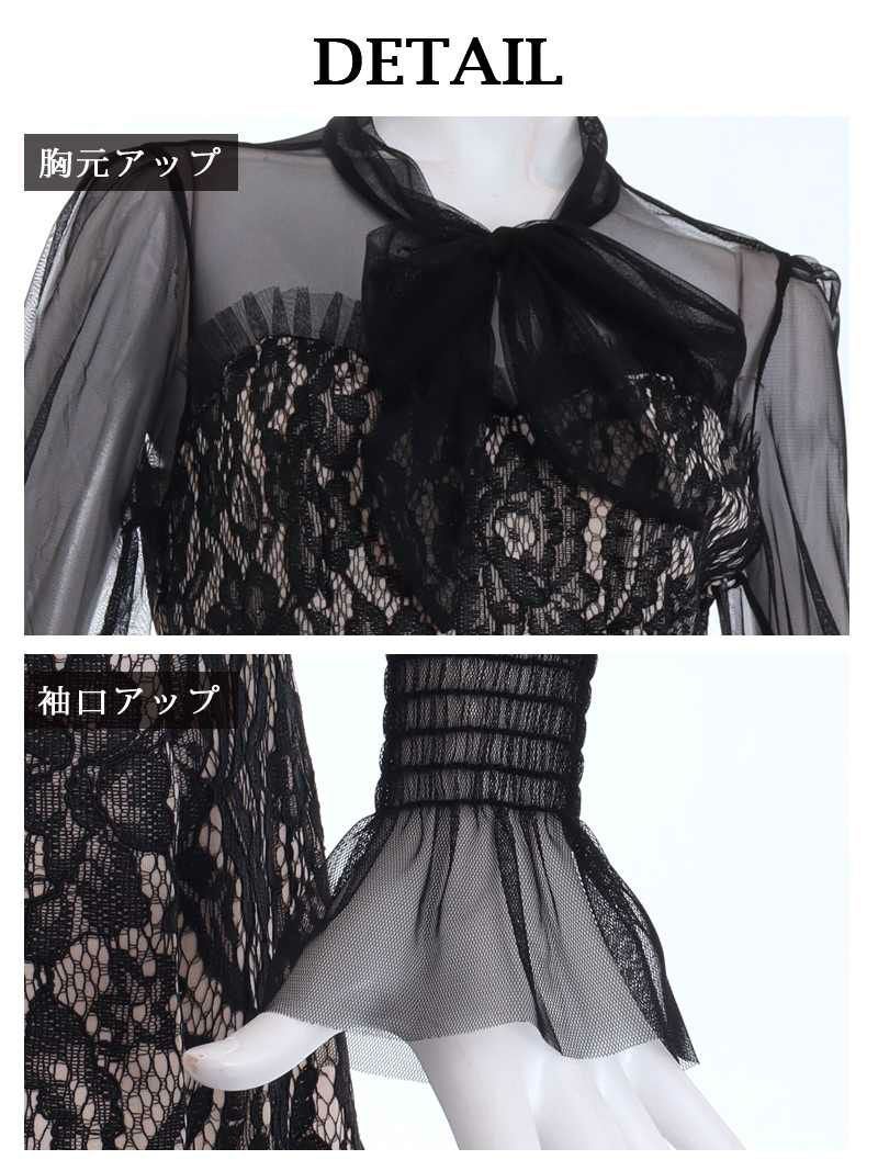 袖付きデザインと透け感レースが、キャバドレスやラウンジシーンに最適な華やかさをプラス。