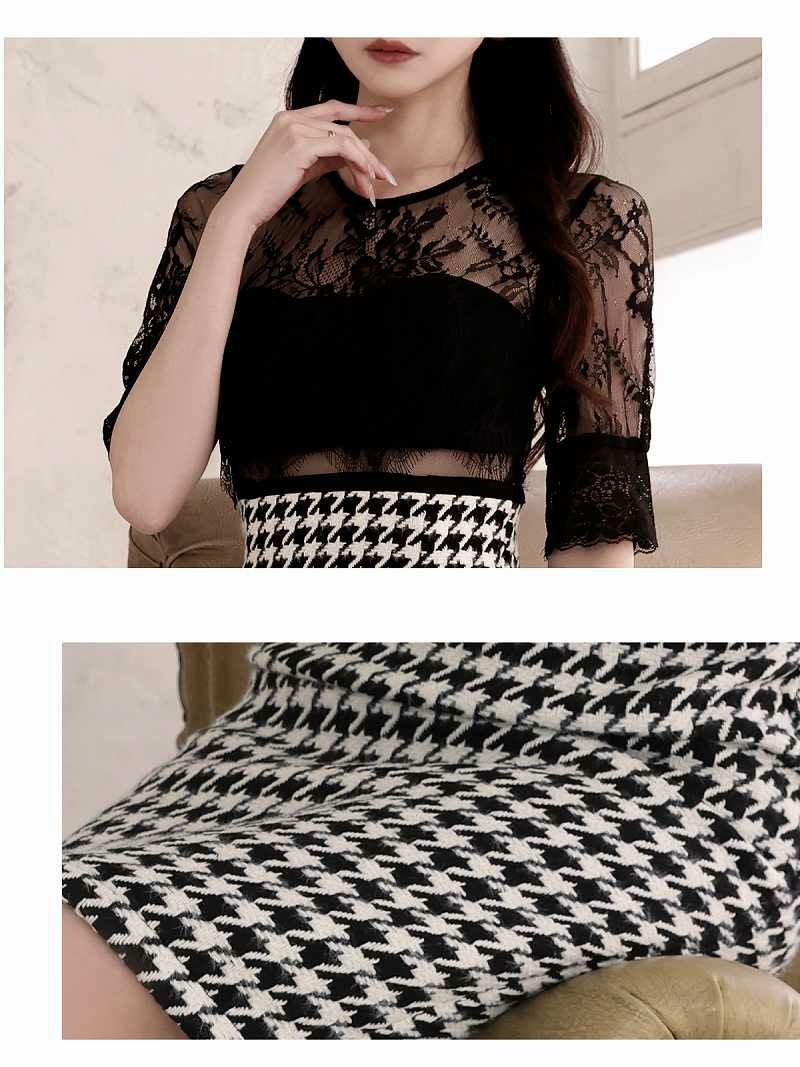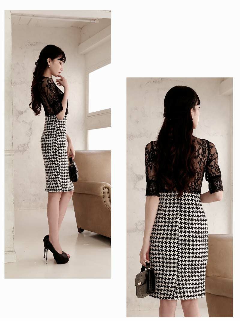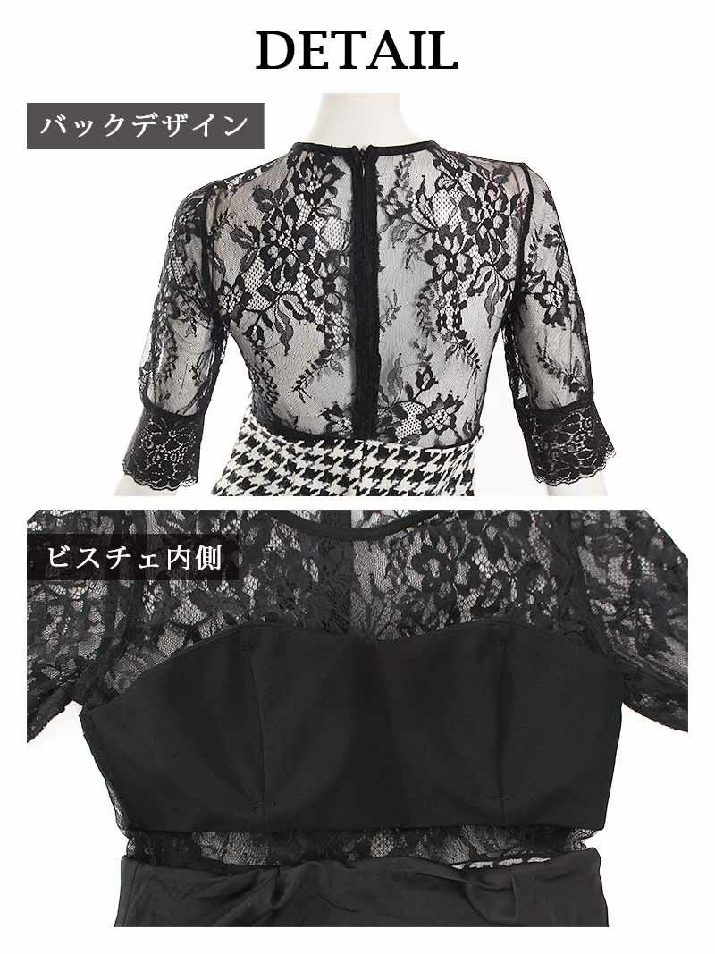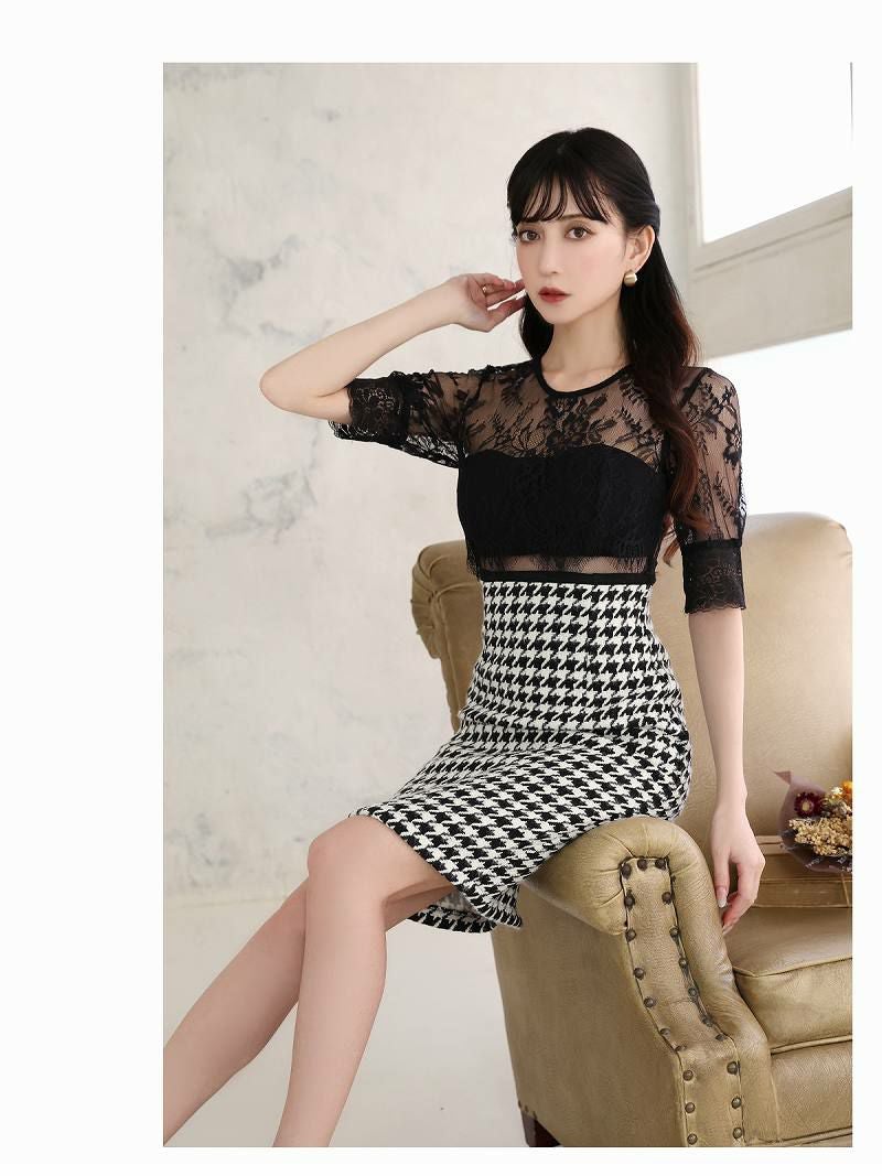千鳥格子チェック柄が印象的な大人のキャバワンピース。ビスチェ風デザインとシアー素材がエレガントで、レースが華やかさを加えます。