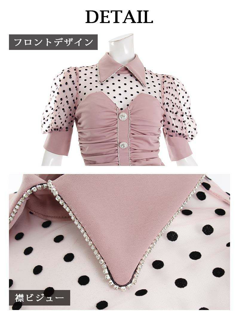 ドット柄デザインが可愛いキャバドレスはデコルテから袖にかけてシアーになっているのでほんのり肌見せができちゃうキャバクラドレスになっています。さらにペールカラーで可愛さをプラス。