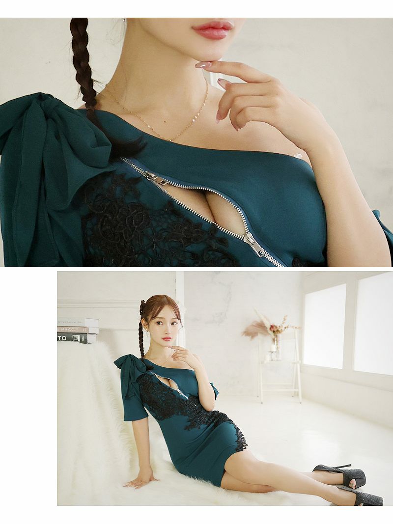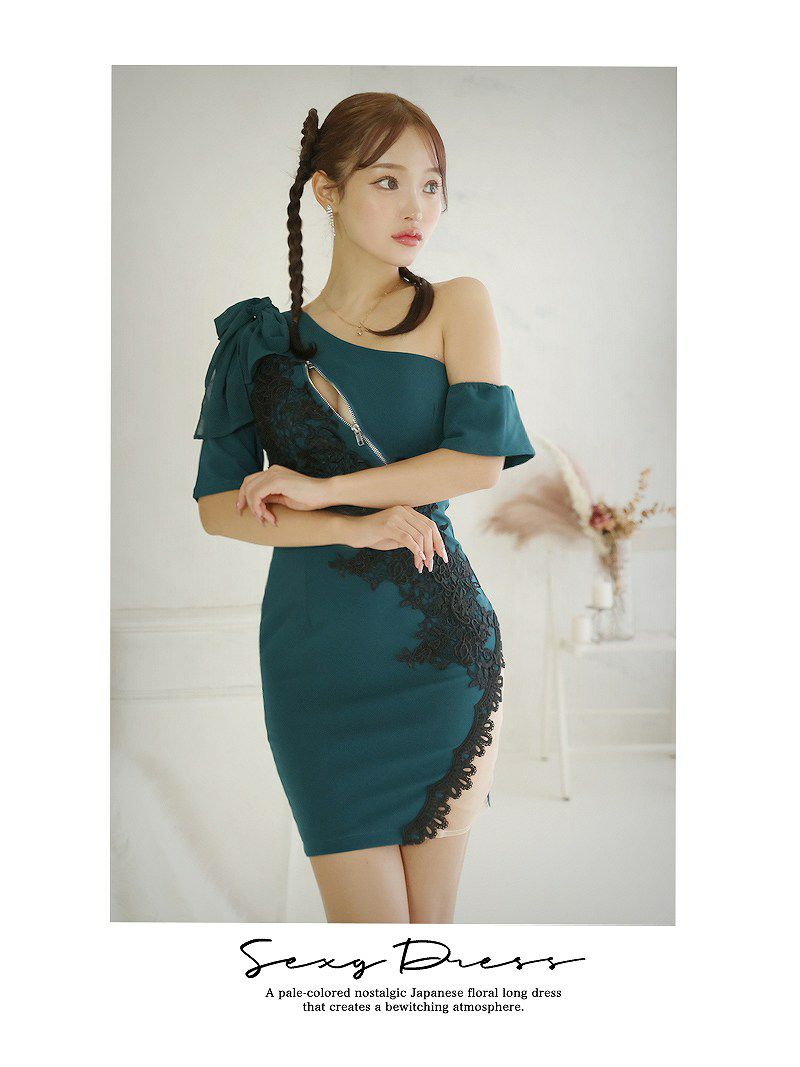 大人の色気でお客様を魅了 セクシー谷間ジップワンショルシアーミニドレス【Ryuyu】(S/M/L)(ワイン/グリーン) ptpl