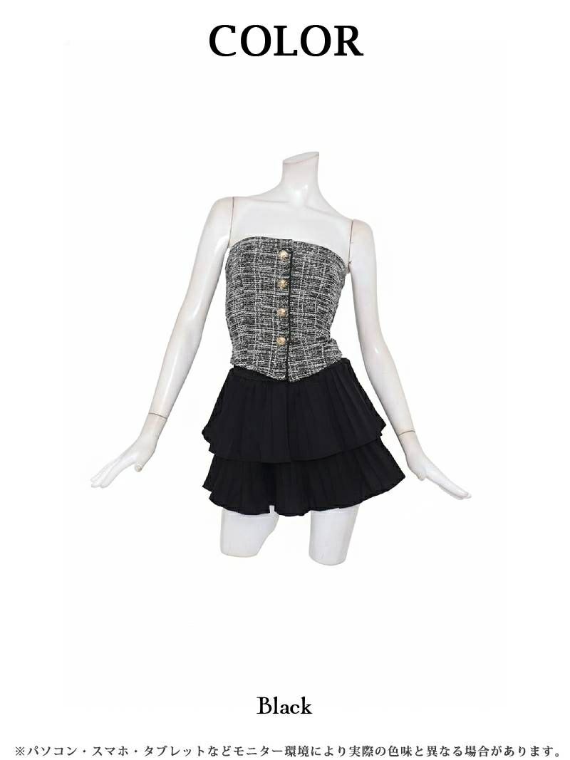 コルセット風デザインとフリルが可愛い、Y2Kムードな韓国風ツイードドレス。 先行予約割¥4480→¥4255!※予約販売※韓国風ドールツイードセットアップ風ミニドレス りせり 着用 キャバドレス【RyuyuChick】(M)(ブラック)