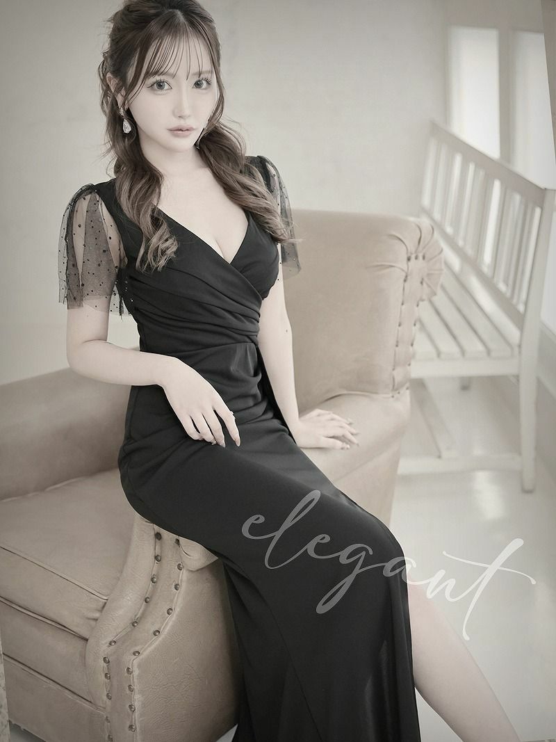 ※一部予約販売※ドット柄シアー袖カシュクール風スリットタイトロングドレス りせり 着用 キャバドレス【RyuyuChick】