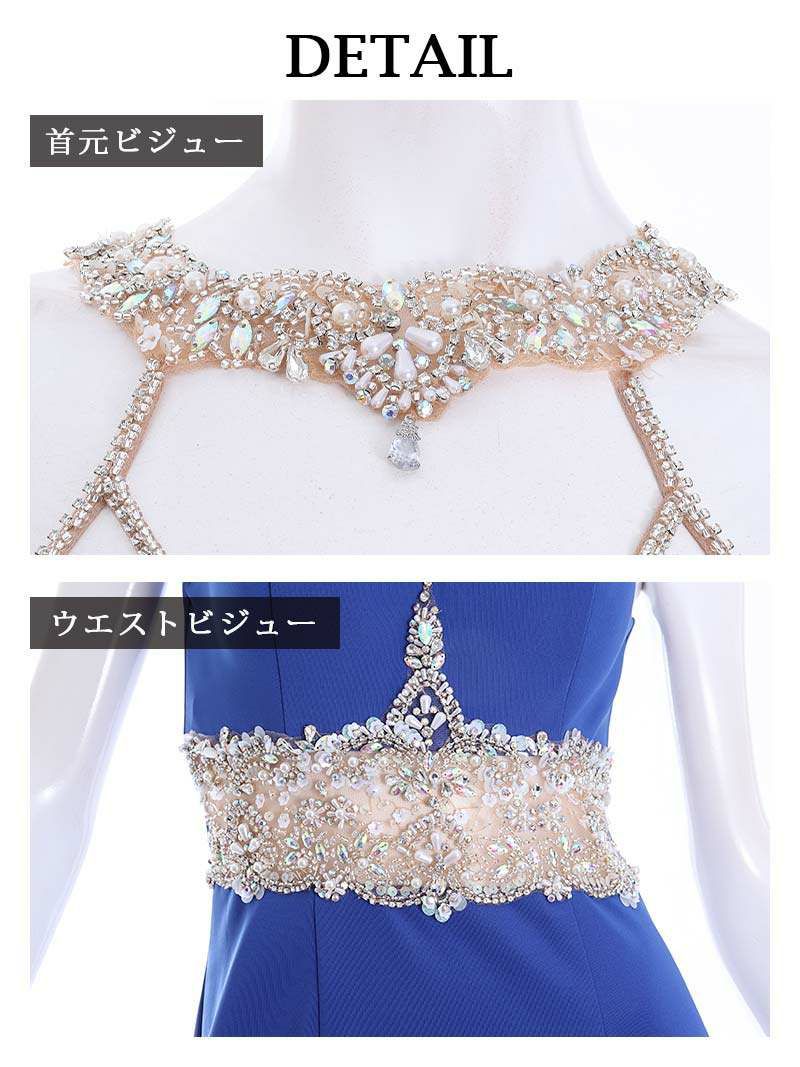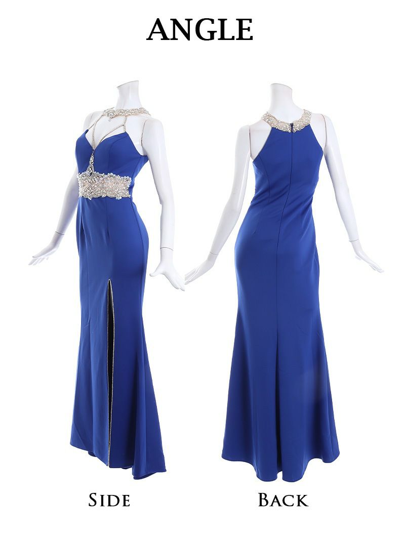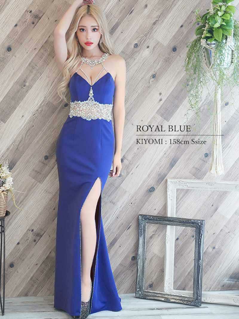 ビジューはウエストだけではなく、デコルテ・首元にもON。ホルターネックデザインだから綺麗にバストも盛ってくれるキャバドレスです。