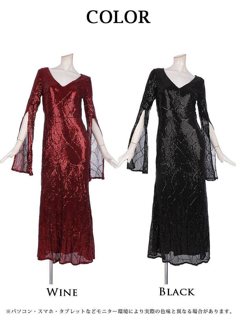 煌めくスパンコールでワンランク上のゴージャスドレス フレア袖付きVカットマーメイドロングドレス 加賀美早紀 着用キャバドレス【Belsia】(M/L)(ワイン/ブラック)