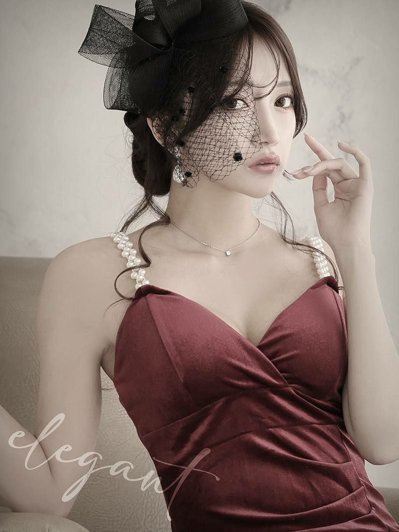 パールストラップが華やかなアクセントになる、上品でセクシーなパーティードレス。