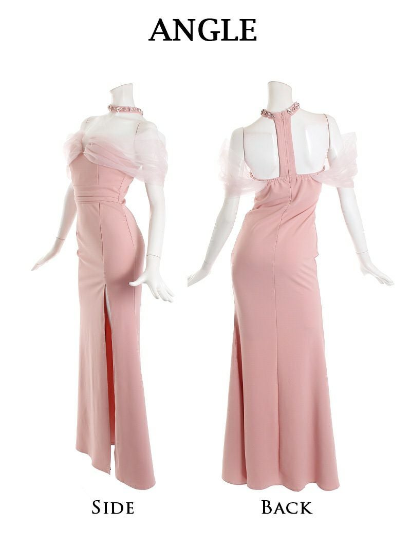 袖付きデザインが上品さを演出し、レース袖とオーガンジーの透け感が華やかさをプラスするロングキャバドレス。二の腕をさりげなくカバーしながら、エレガントな雰囲気を引き立てます。