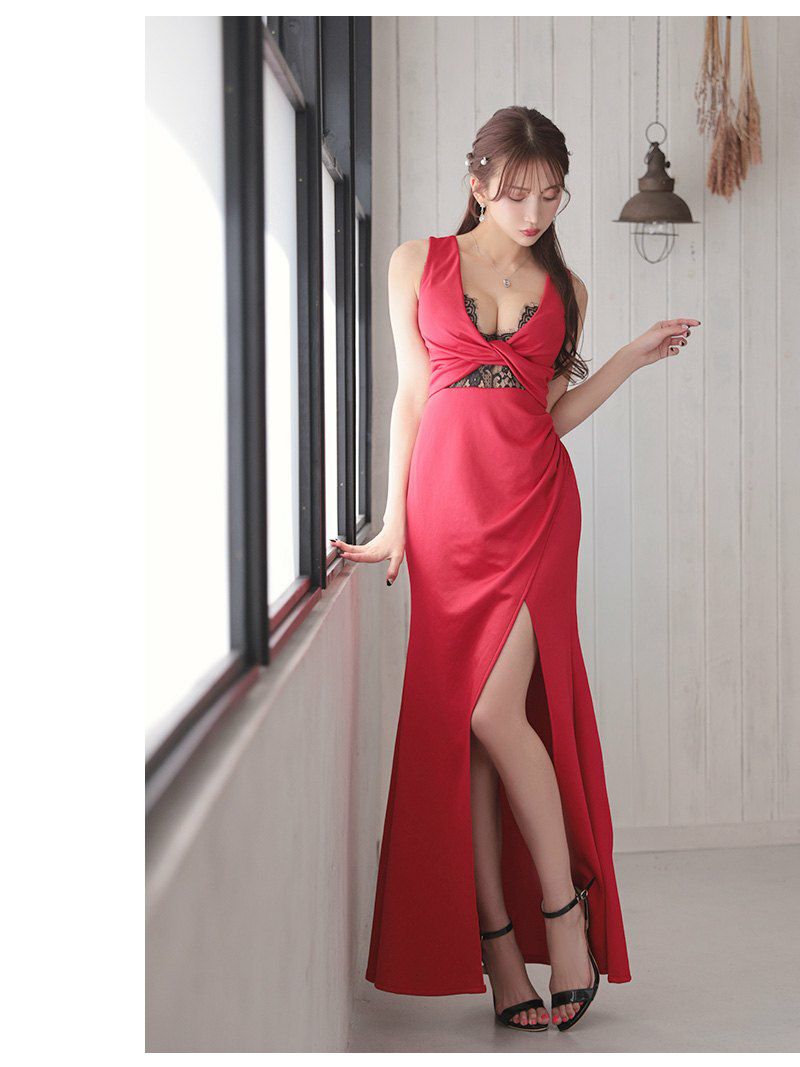 レッド×ブラックレース大胆谷間見せセクシーロングドレス【Ryuyu】