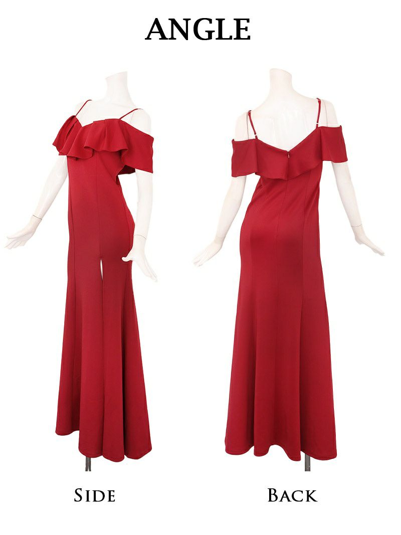 胸元と肩周りを飾る大きなフリルのオフショルダーが、デコルテを美しく華やかに見せてくれます。