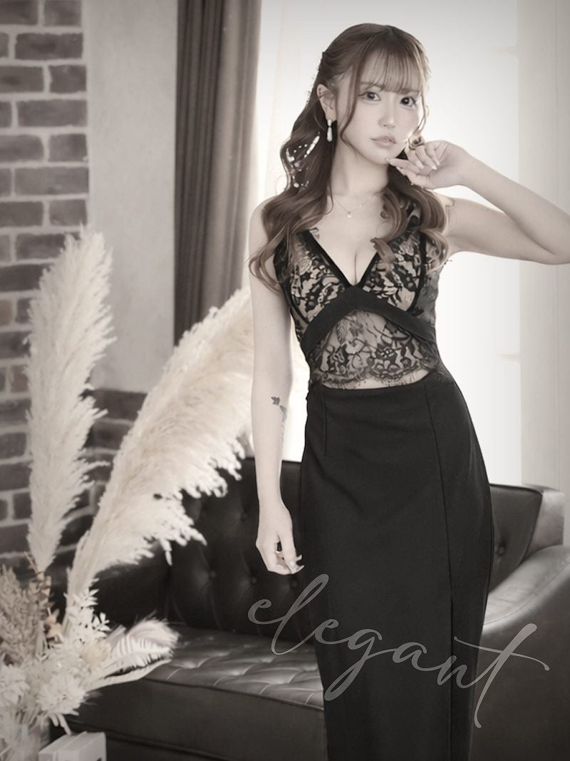 ランジェリー風の透け感レースと大胆なスリットが色気を引き立てるウエスト見せロングドレス りせり 着用 キャバドレス【RyuyuChick】
