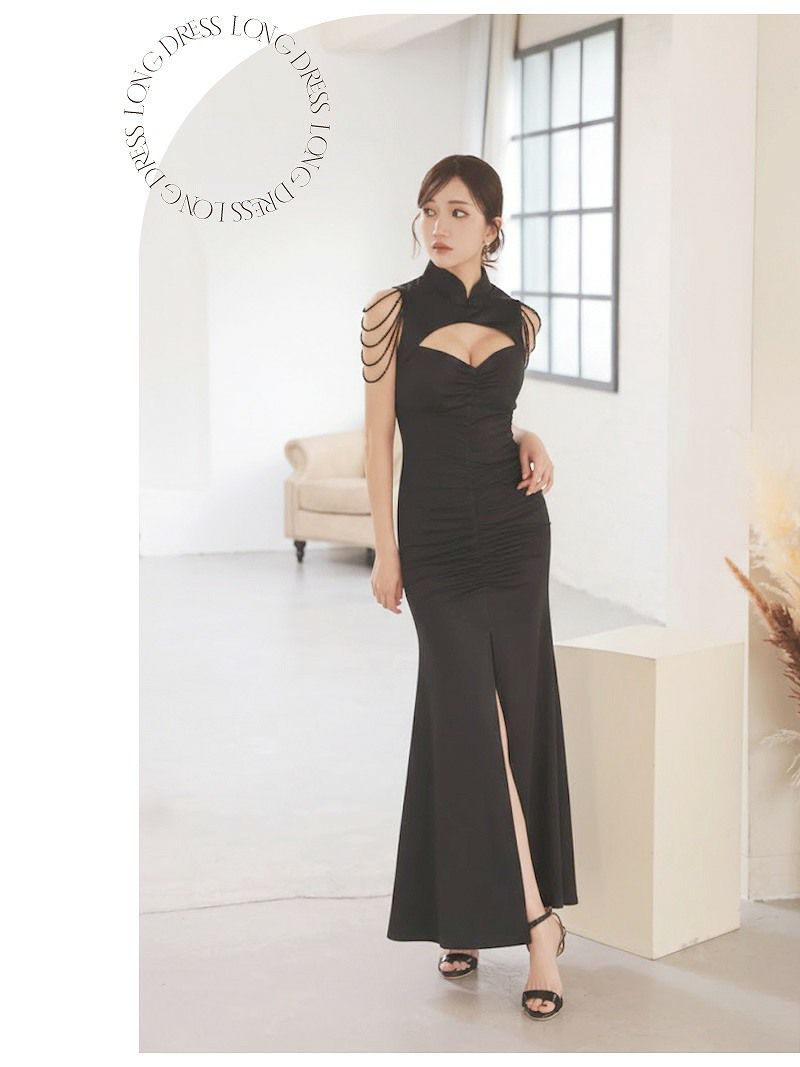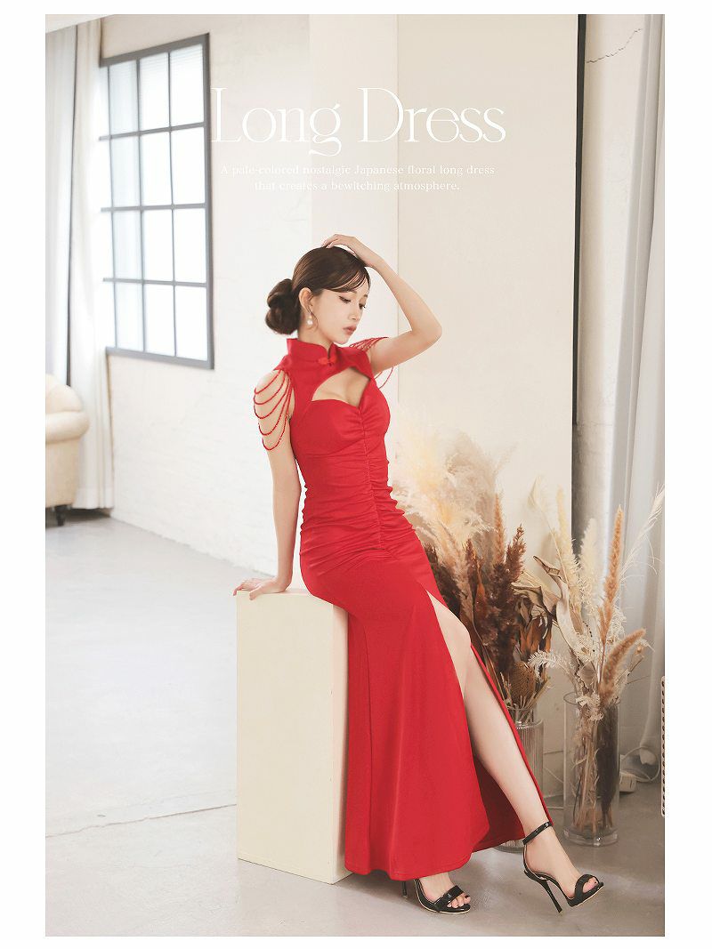 シャンデリアビーズが華やかに揺れるチャイナ風の谷間みせセクシー大人ロングドレス 【Ryuyu】