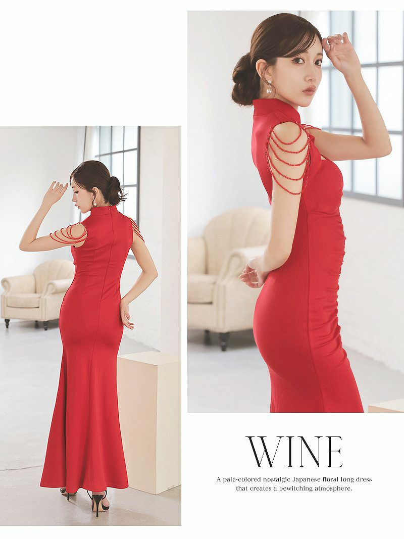 5. シャンデリアビーズが華やかに揺れるチャイナ風の谷間みせセクシー大人ロングドレス 【Ryuyu】(S/M/L)(ワイン/ブラック)