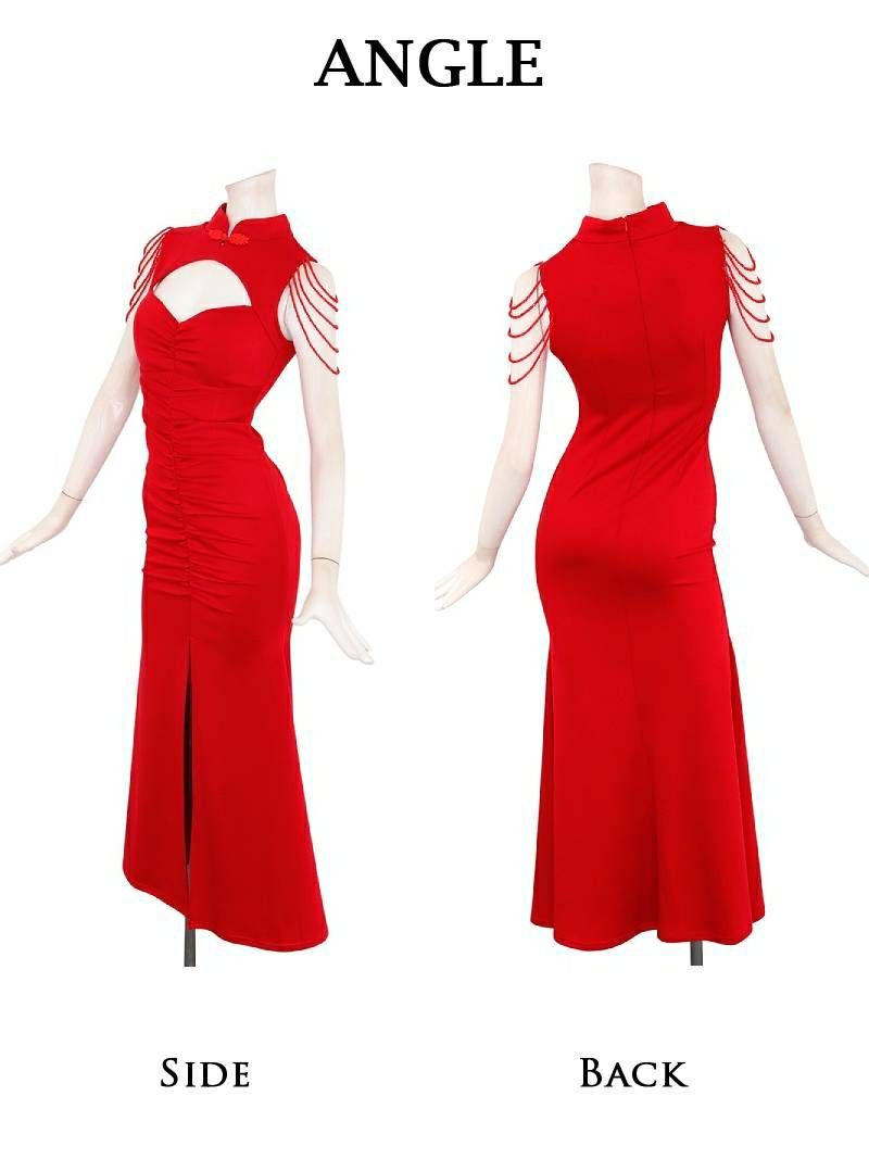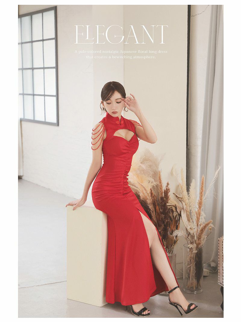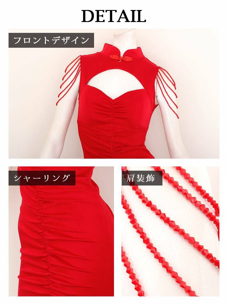 チャイナ風の襟元に大胆なカットアウトを施し、色気たっぷりに谷間みせができるデザインです♪