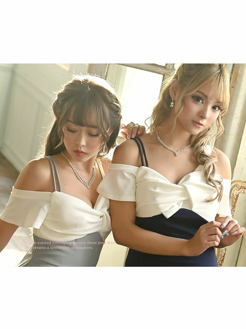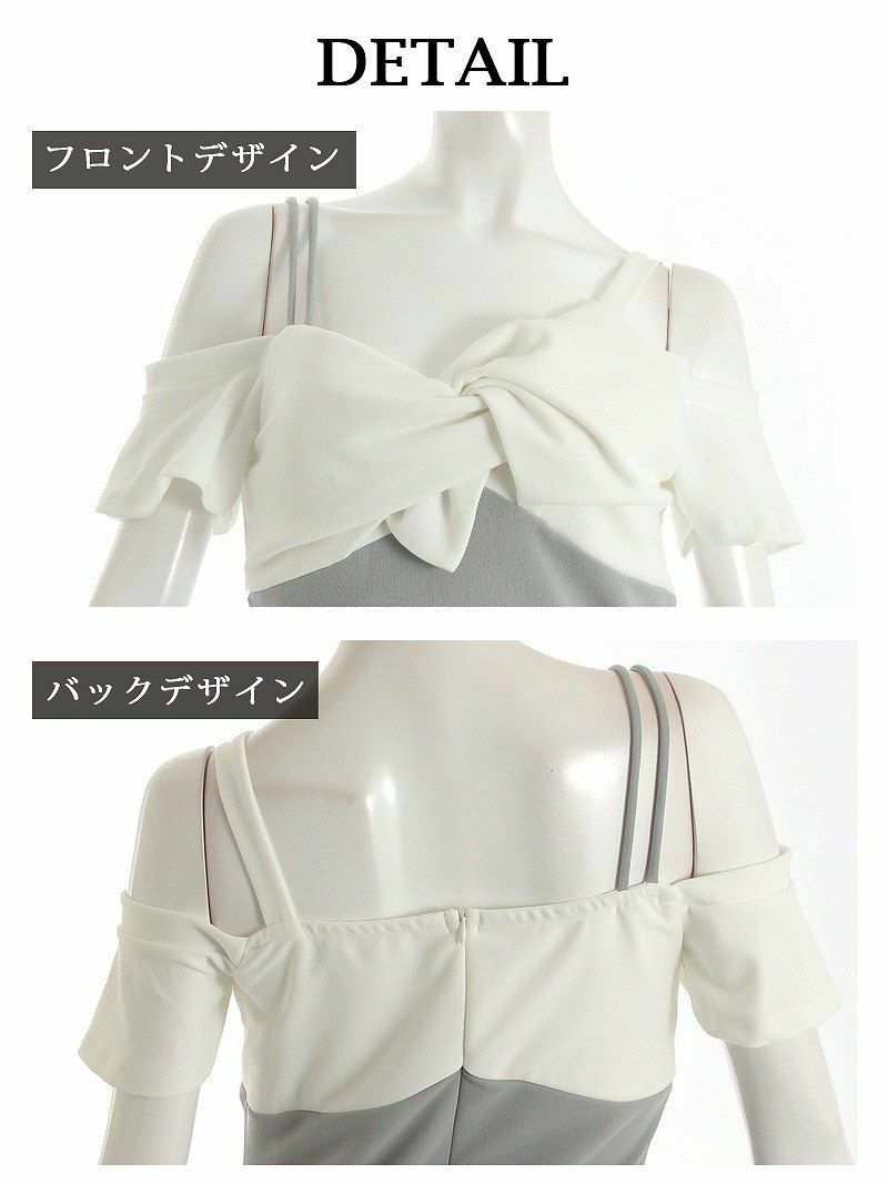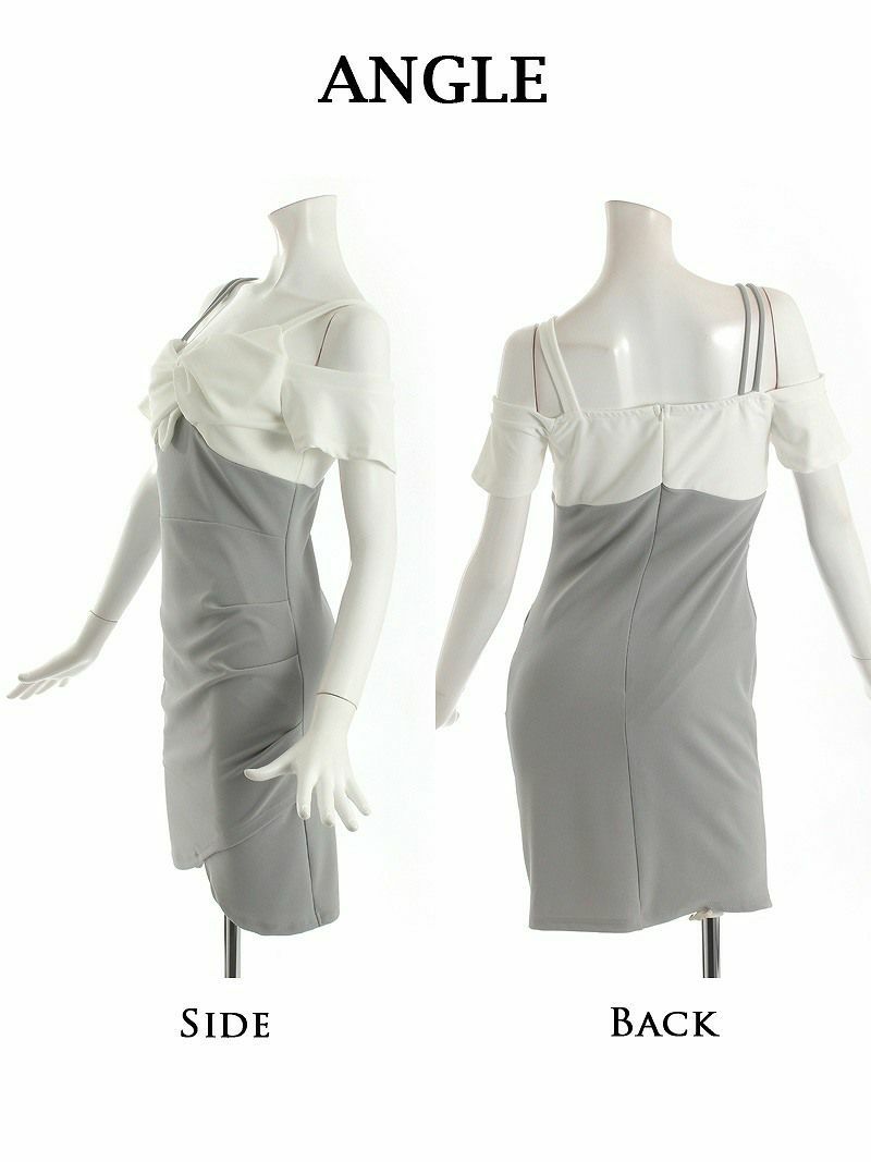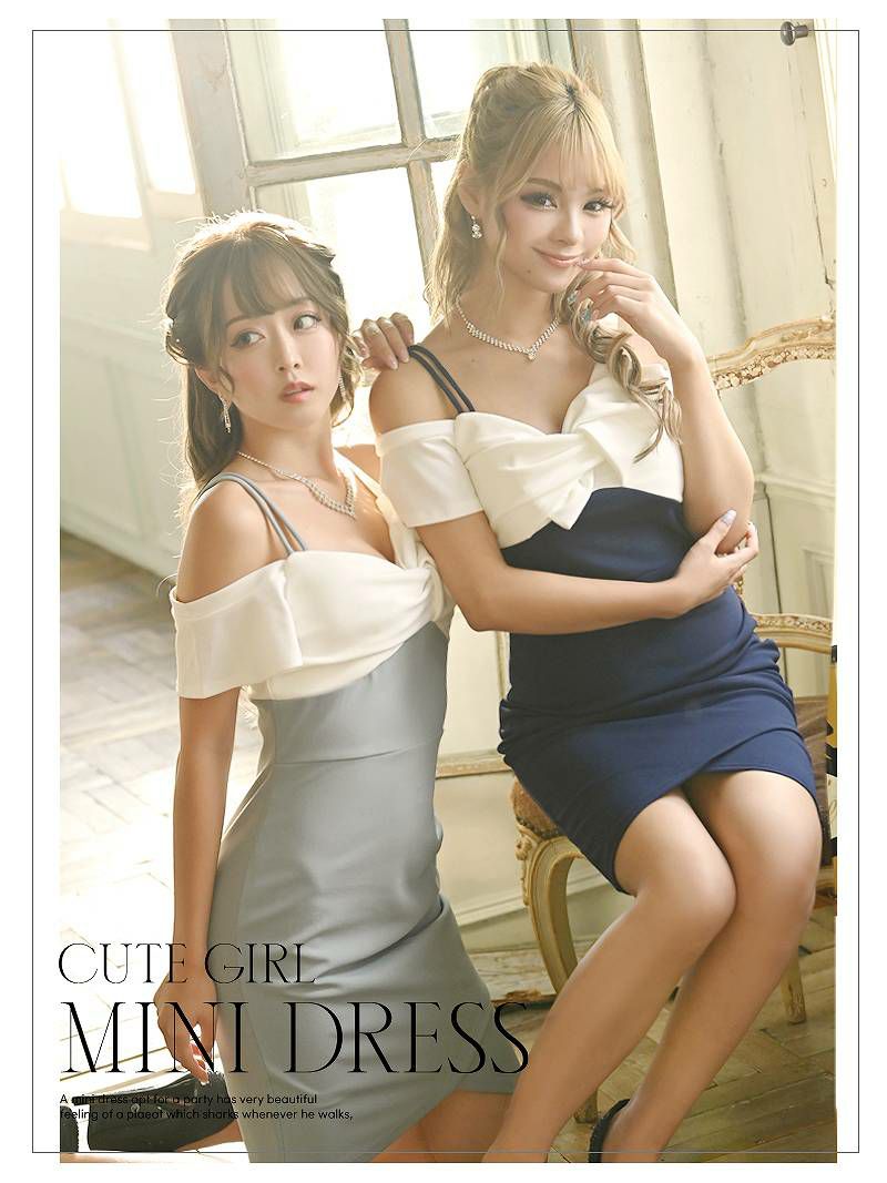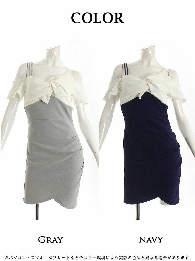 バストのリボンデザインであざとさアピール! 袖付きオープンショルダーバイカラーキャバドレス みりちゃむ まぁみ 着用ミニドレス【Ryuyu】(S/M/L)(グレー/ネイビー)