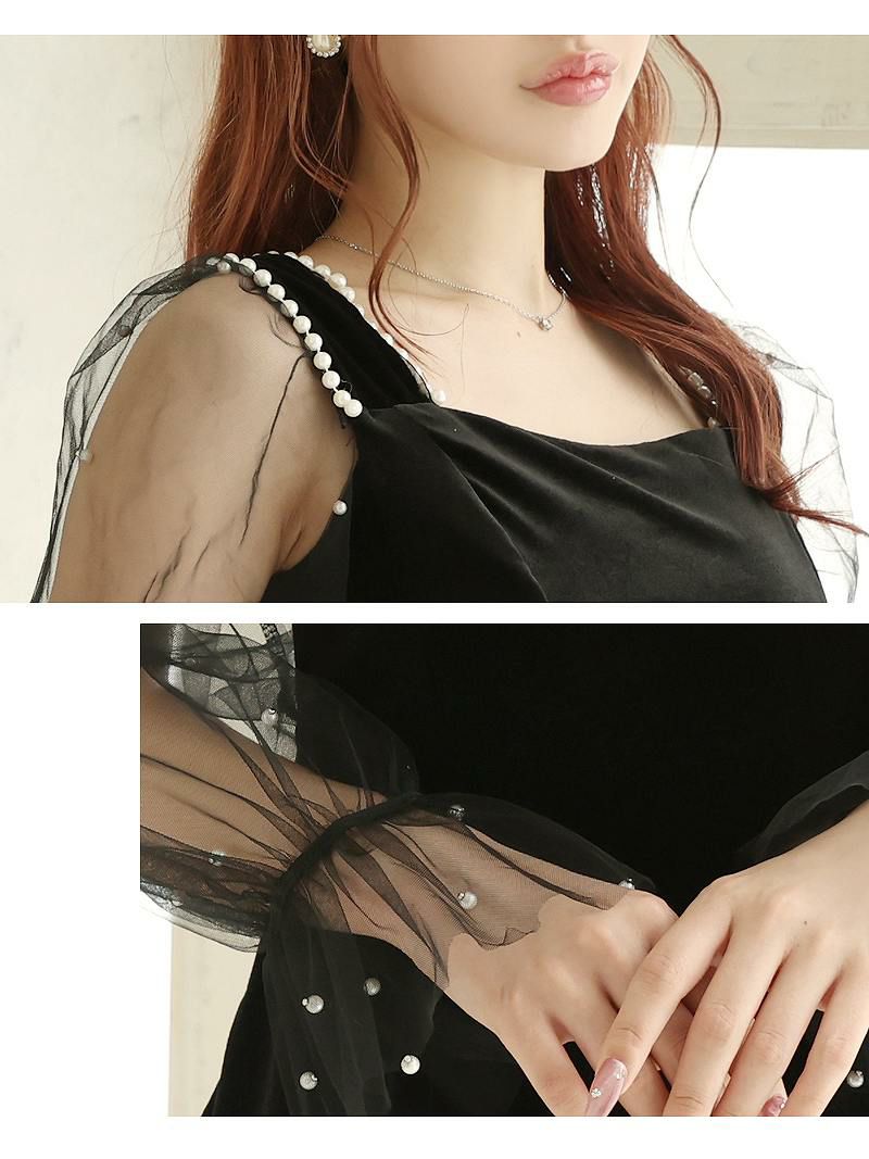 チュール袖×パールのデザインがドーリーなキャバドレスです。