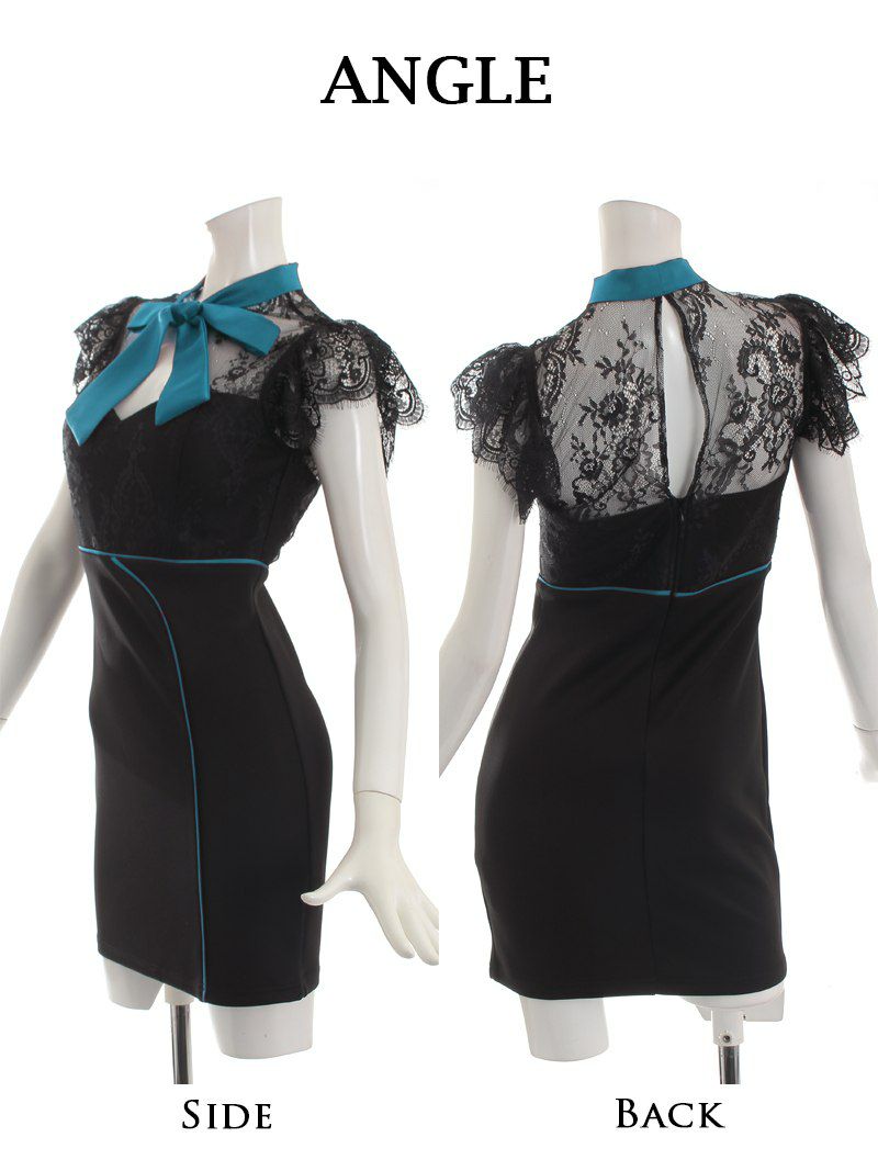黒レースに差し色のビビットカラーが大人可愛い ネックリボンバストカットミニキャバドレス【RyuyuChick】(S/M/L/XL)(ブルー)