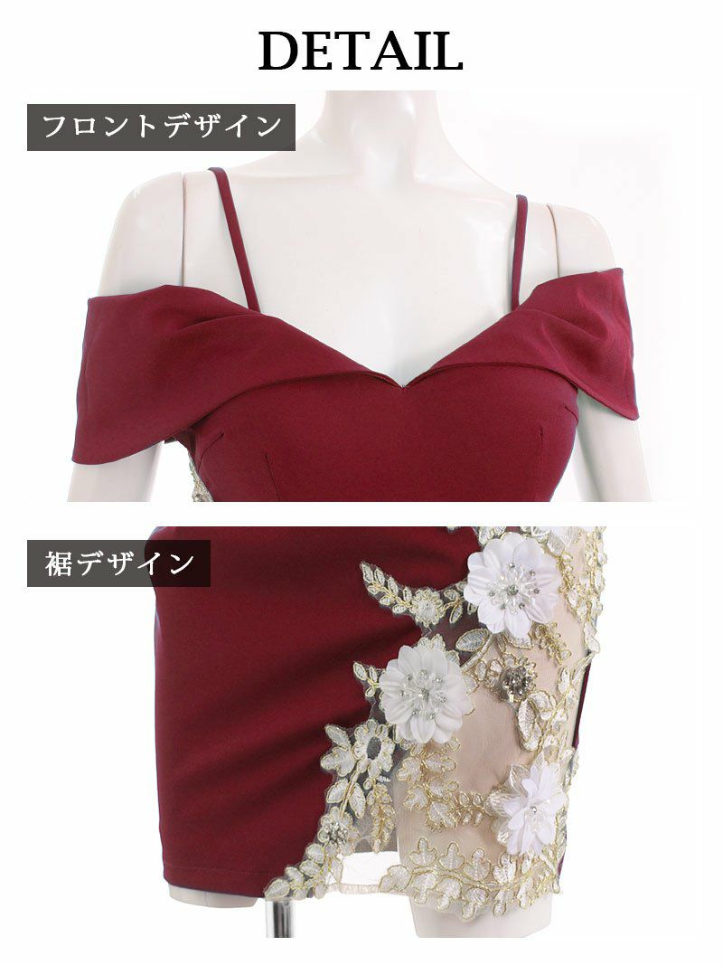シンプルなワンカラードレスを豪華な花柄刺繍と3D立体フラワー&ビジュー使いで、ワンランク上の膝丈タイトドレスに。