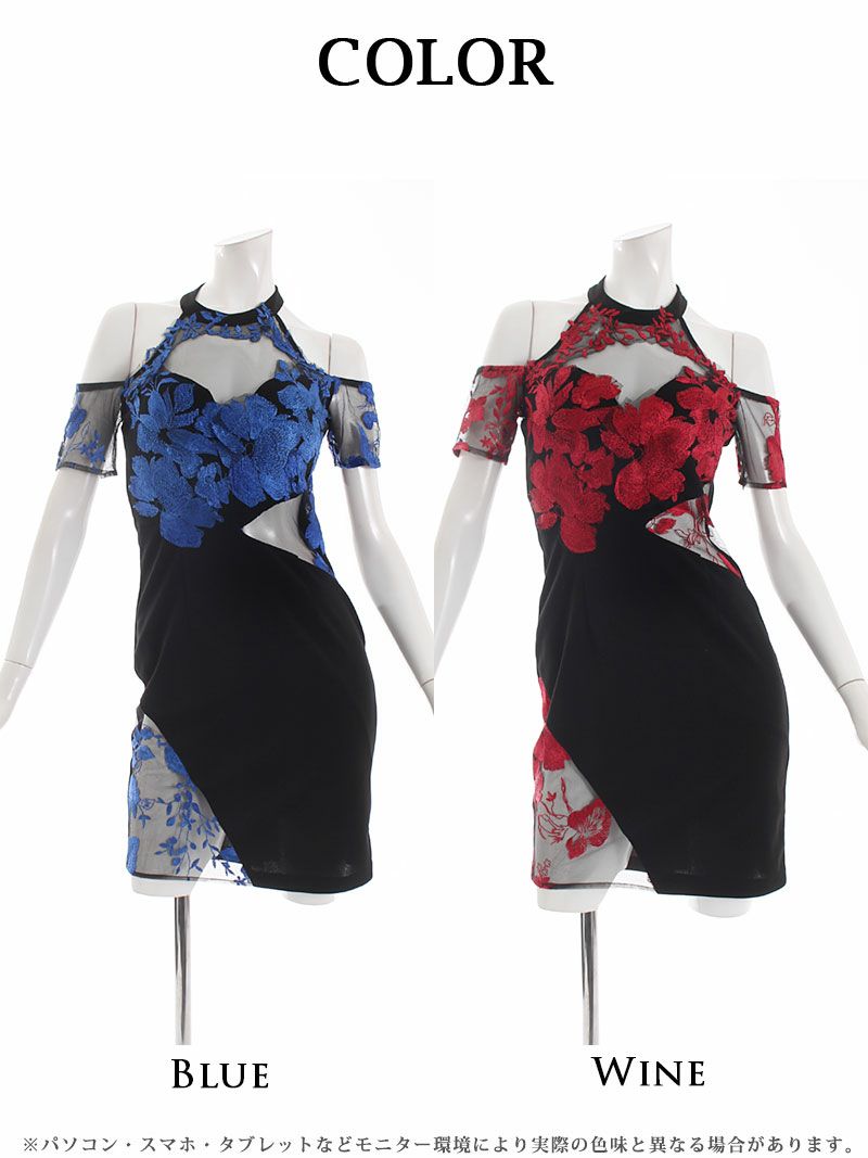 XLサイズ追加!鮮やかな花柄刺繍で高見え 大判刺繍シアーメッシュ谷間魅せミニドレス【Ryuyu】(S/M/L/XL)(ブルー/ワイン)