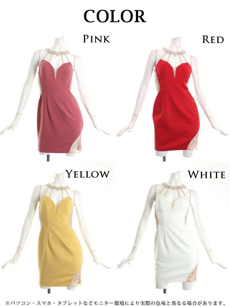4. 【Angel R/エンジェルアール】パールビジュー付き谷間見せミニキャバドレス(S/M)(ホワイト/イエロー/ピンク/レッド)