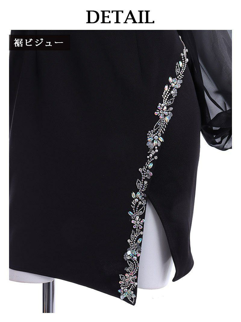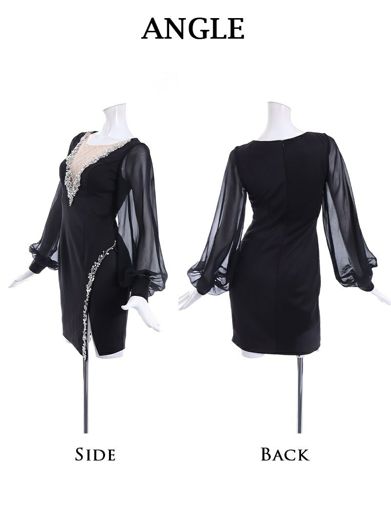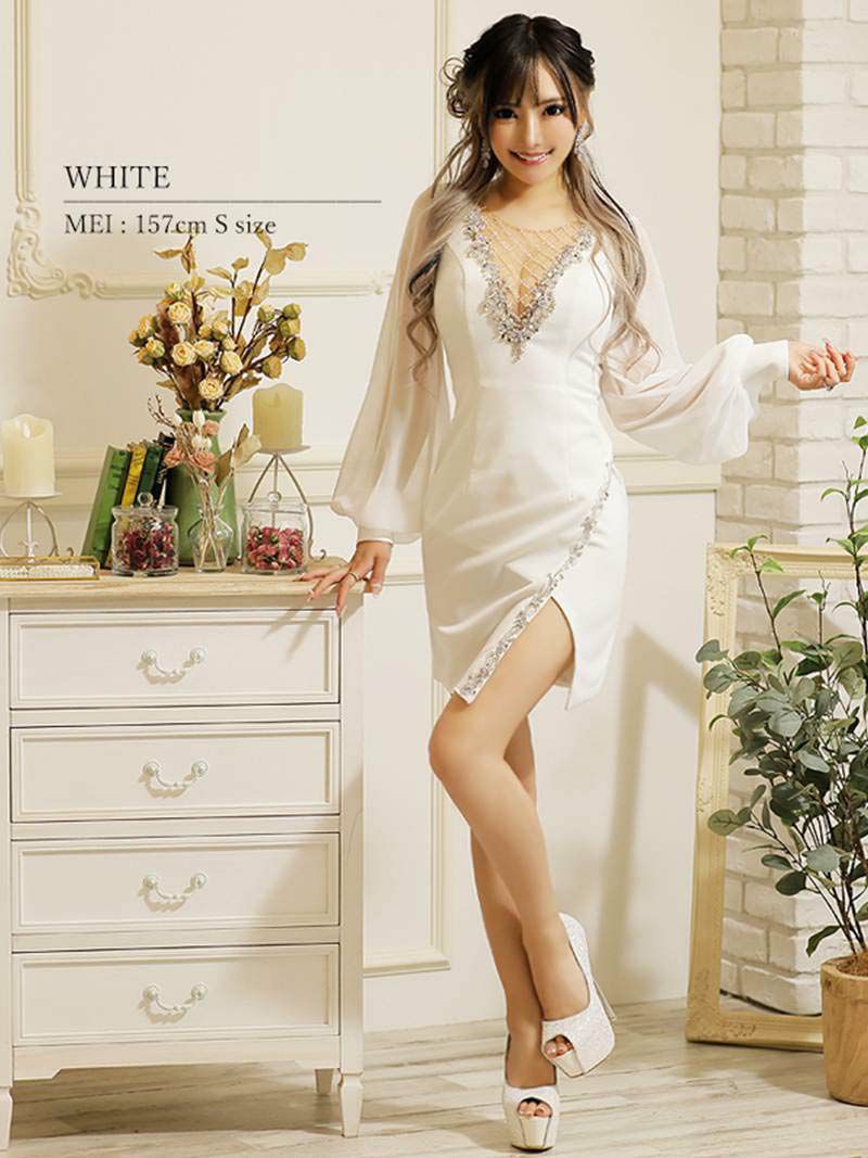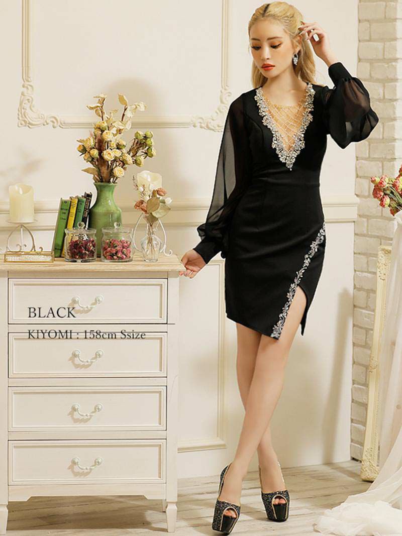 谷間魅せ×長袖で色気と上品さどっちも叶うミニドレス。 胸元のビジューがきらめいて顔周りもパッと明るく演出! 二の腕をさりげなく隠せるシアー袖がマジで神な体型カバードレス。 スリットのビジューがチラ見せでヌケ感ちょうどいい! 初心者さんも挑戦しやすい高級キャバドレス。