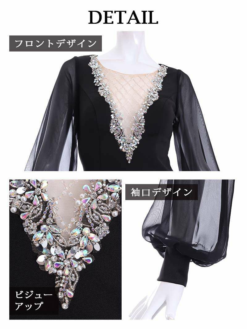 胸元で煌めく高級ビジュー 【Angel R/エンジェルアール】上品シアー長袖タイトキャバドレス(S/M)(ブラック/ホワイト)