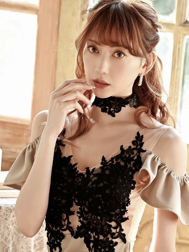 随所のブラックレースが絶妙な色気を引き出す シアーブラックレースオープンショルダーキャバドレス 加賀美早紀 着用ミニドレス【Belsia】(S/M/L)(グレージュ)