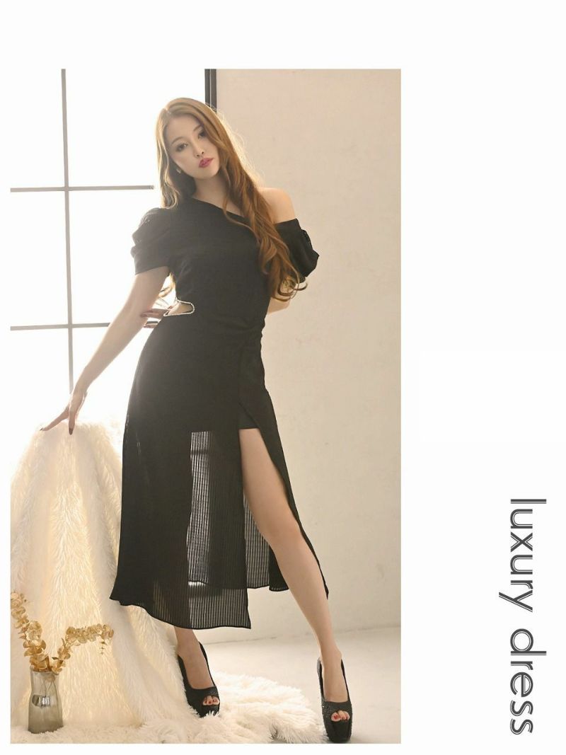 4. アシンメトリーデザインカッティング半袖ロングドレス りおん 着用 キャバドレス【RyuyuChick】(S/M/L/XL)(ブラック/レッド)