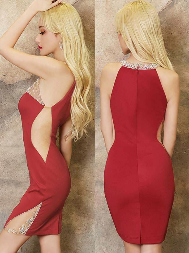 デコルテに光輝うビジュードレス 【Angel R/エンジェルアール】谷間魅せワンカラービジューミニタイトキャバドレス(S/M)(ブラック/レッド/パープル)