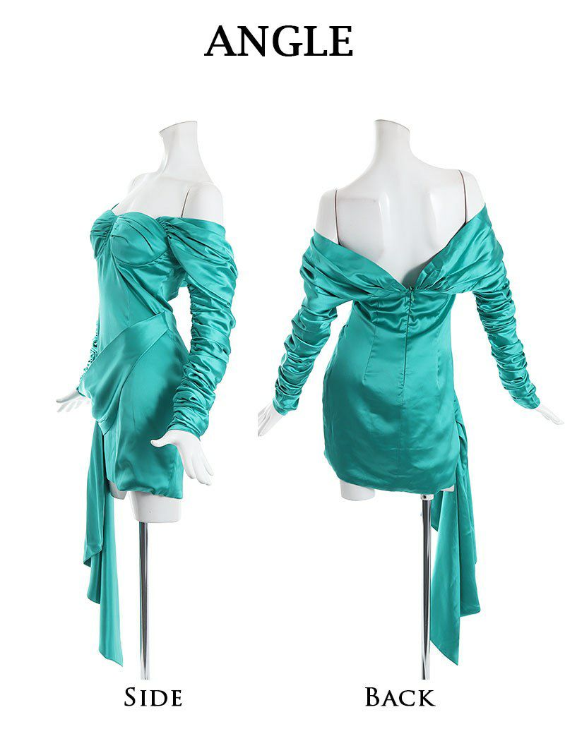 オフショルダー袖付きグリーンカラーサテンキャバドレス【BelsiaLUX】