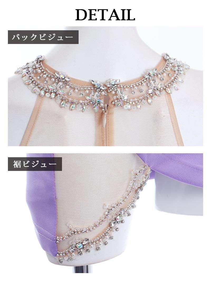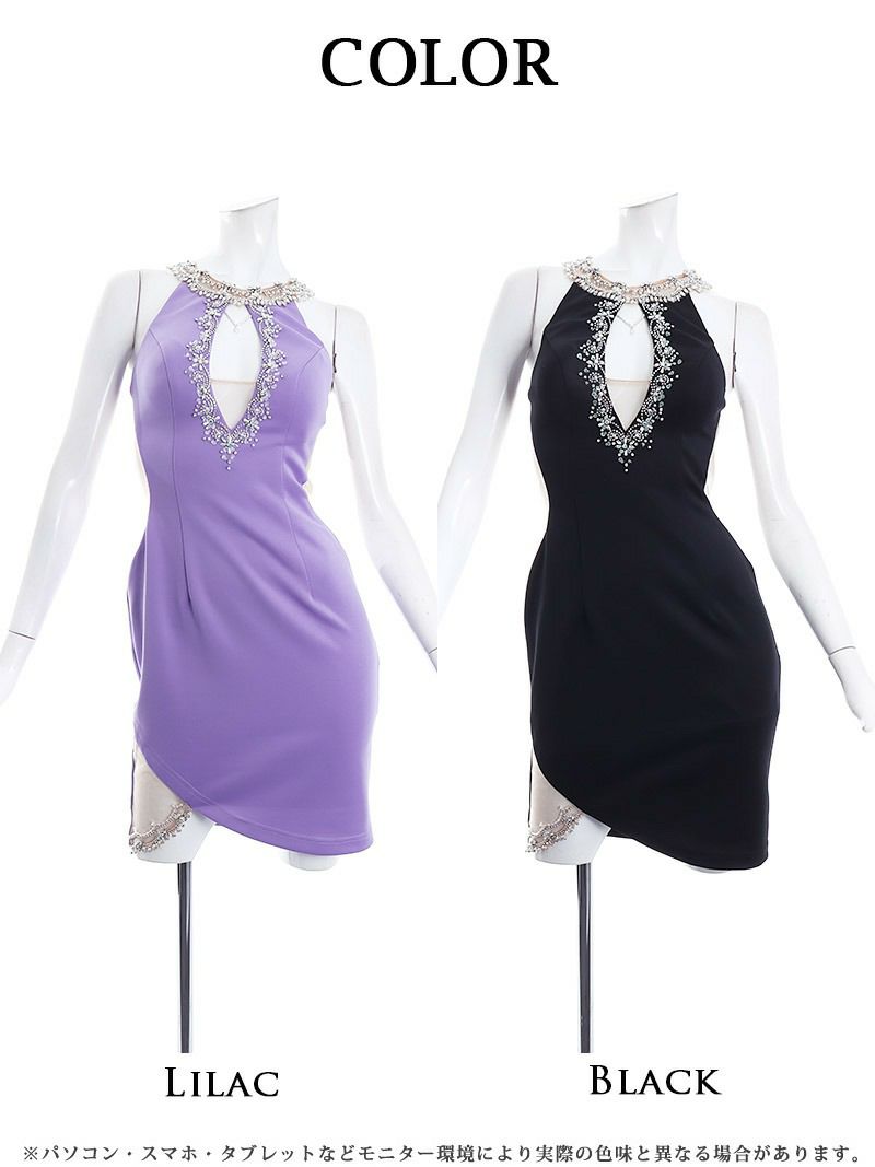 ビジューが輝くホルターネックで一気に主役級なキャバドレス。 背中透けデザインでヌーディーな色気を演出! バストカットで谷間魅せ!色っぽオーラ全開なミニドレス。 裾スリットがシアー素材でセクシーなドレス。 暗い店内でも映える!大人のお姉さん向けドレス。