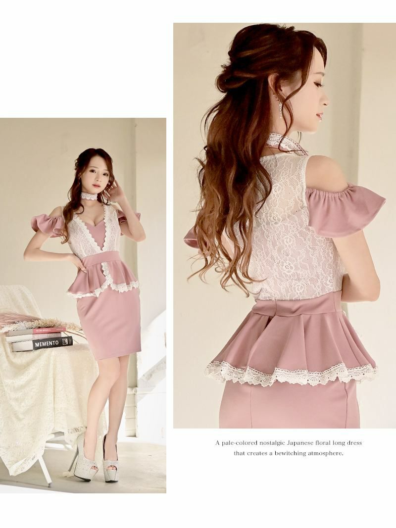 大人可愛い雰囲気でSNS映えも狙う♪ オープンショルダーレースデザインタイトミニ丈キャバドレス【Ryuyu】(S/M/L)(ピンク/グレー/ベージュ)