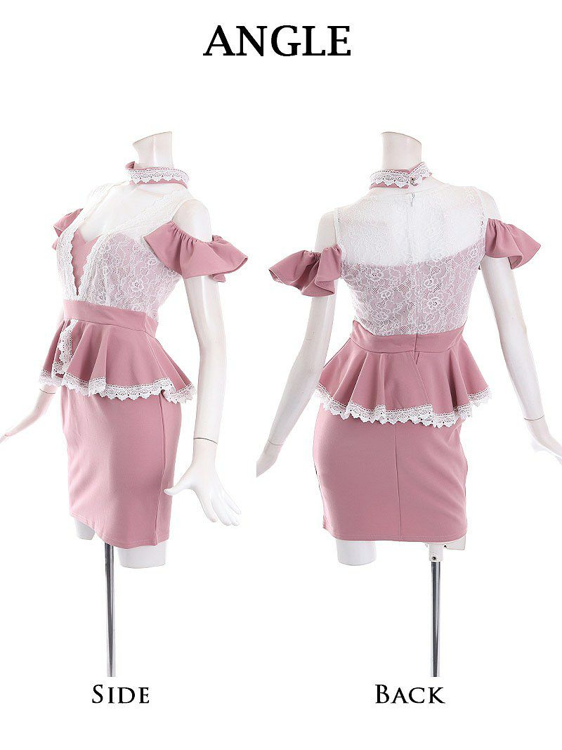 5. オープンショルダーレースデザインタイトミニ丈キャバドレス【Ryuyu】(S/M/L)(ピンク/グレー/ベージュ)