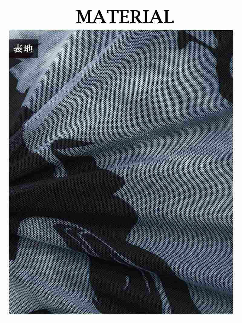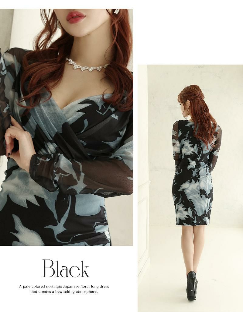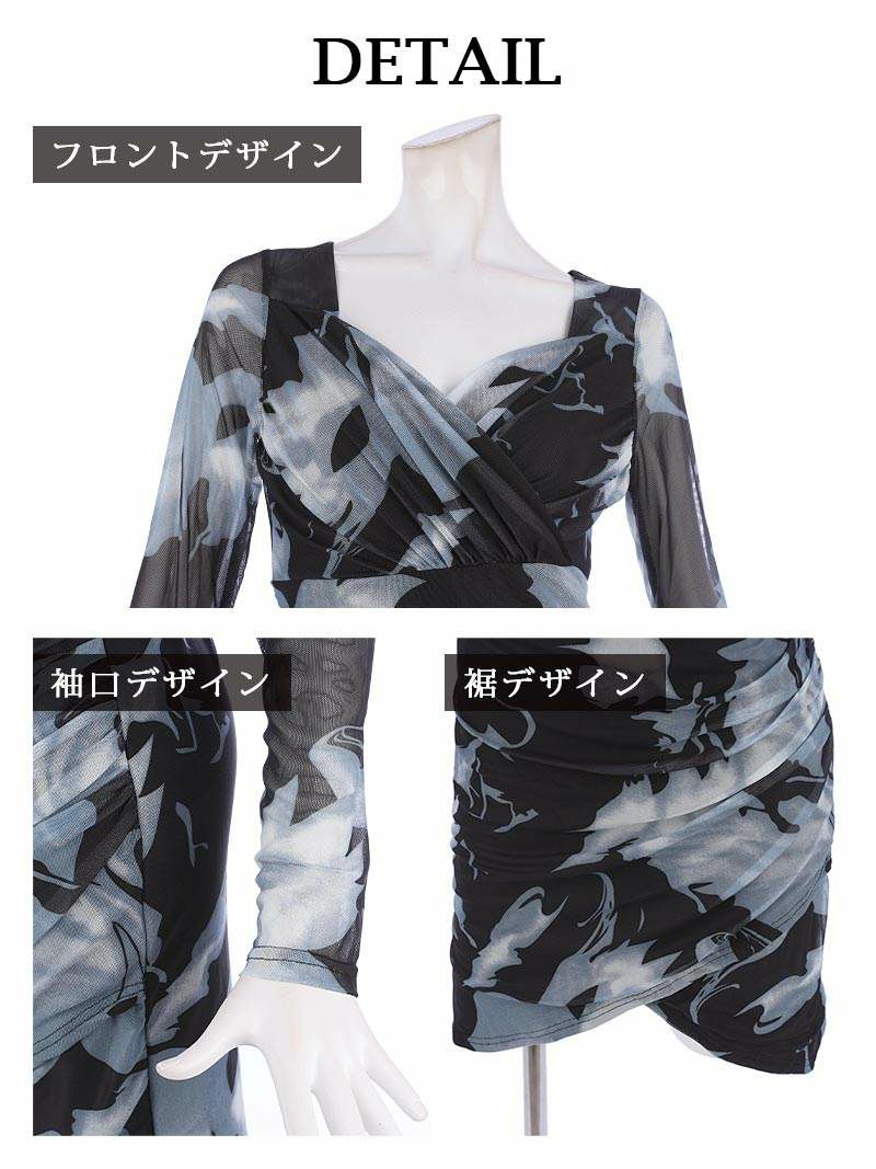 カシュクールデザインとメッシュの長袖がエレガントさを演出し、袖付きで気になる部分も体型カバーが可能です。