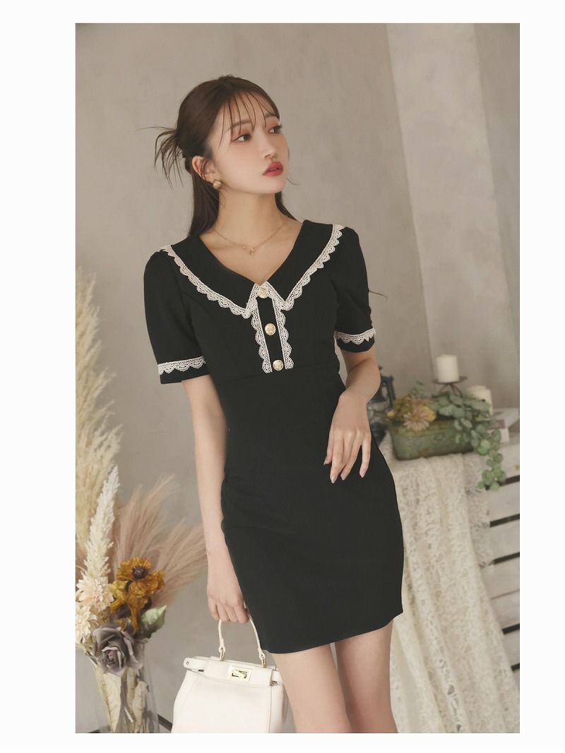 5. レース付き袖が可愛い半袖タイトミニ丈キャバワンピース【Ryuyu】(S/M/L)(ブラック)