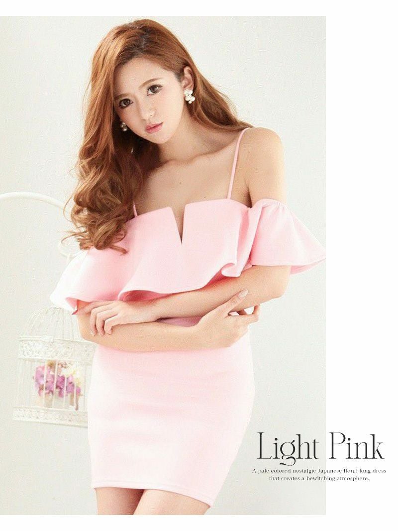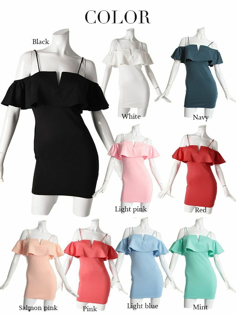 4. 【訳ありアウトレット】ミニドレス袖付きオフショルティアードフリルキャバドレス【RyuyuChick】(S/M/L)(ブラック/ホワイト/レッド/ピンク/ミント/ネイビー/ライトピンク/ライトブルー/サーモンピンク)