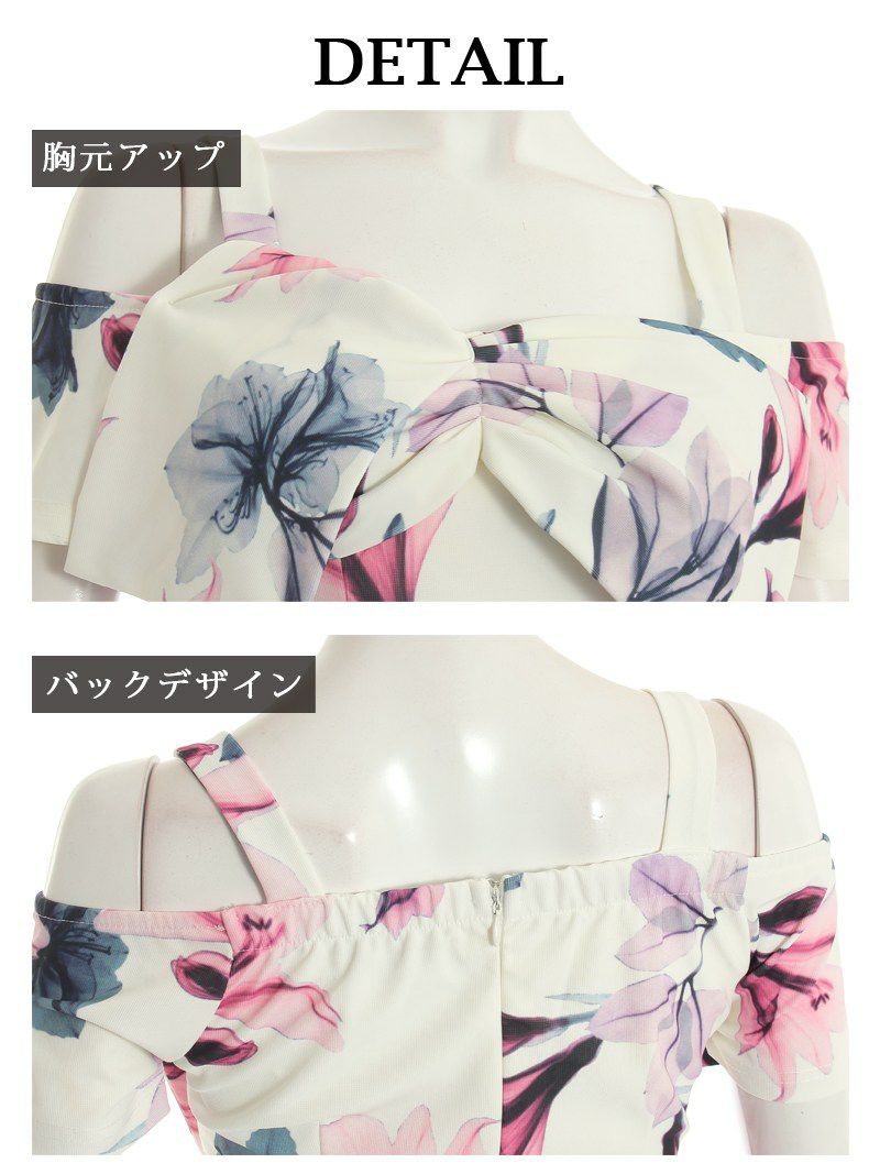 花柄のフラワーリボンが華やかさをプラスし、タイトなシルエットでボディラインを美しく演出。
