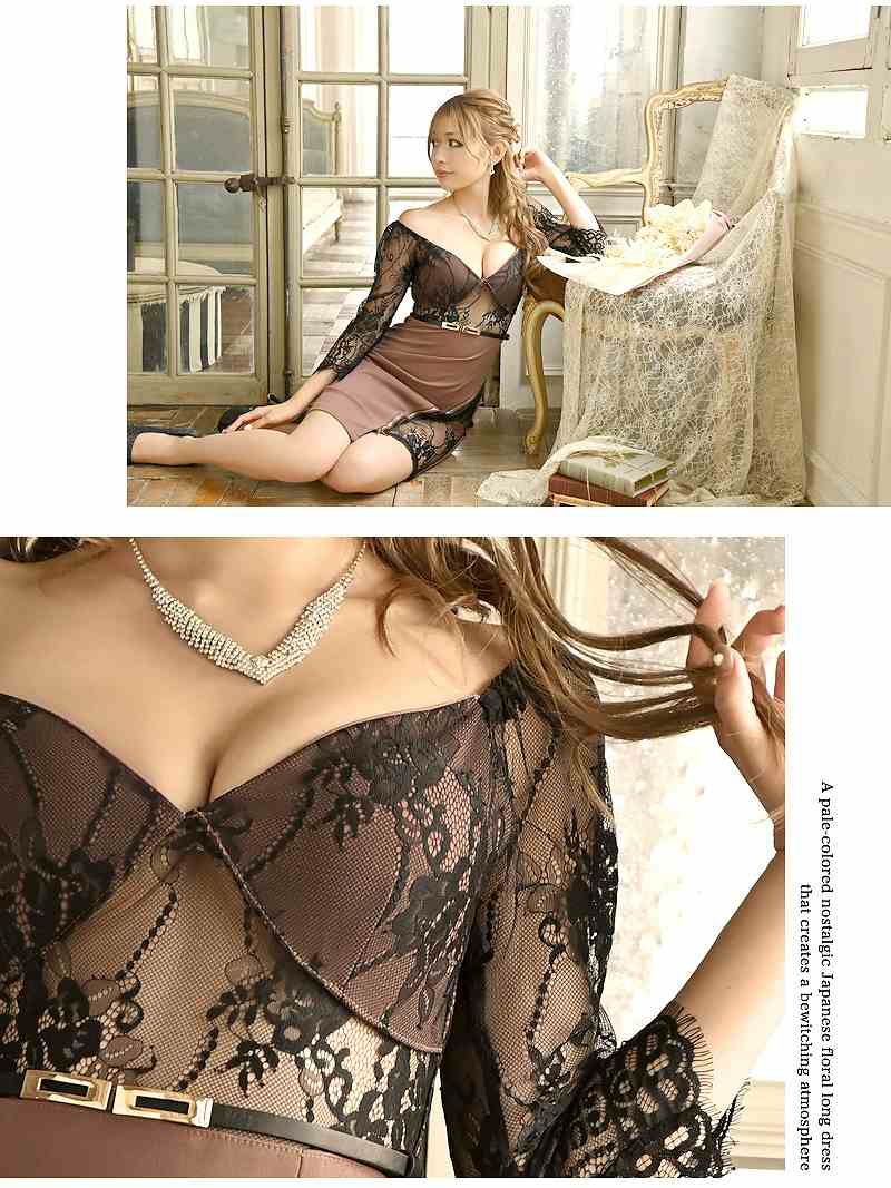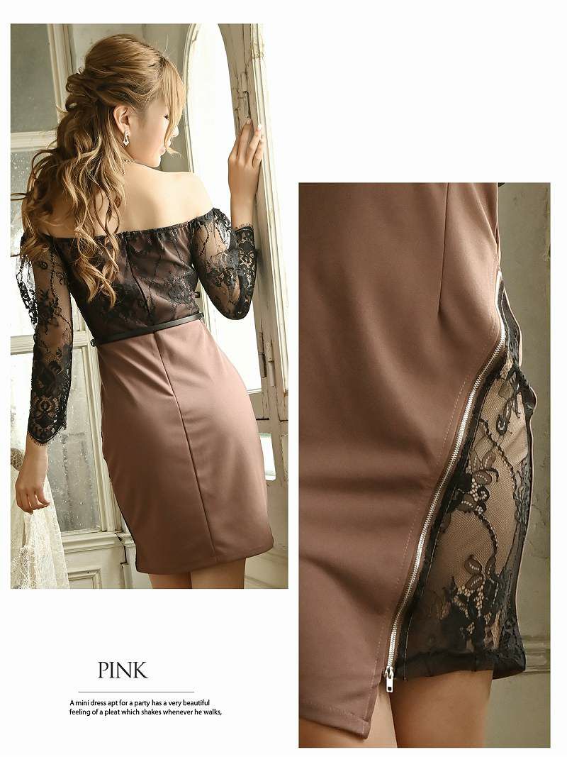 エレガントなレース素材とセクシーなオフショルデザインが魅力的なキャバドレス。