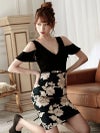 肩魅せデザインとVネックでセクシーさをプラス、ウエストの切り替えが美しいラインを作ります。