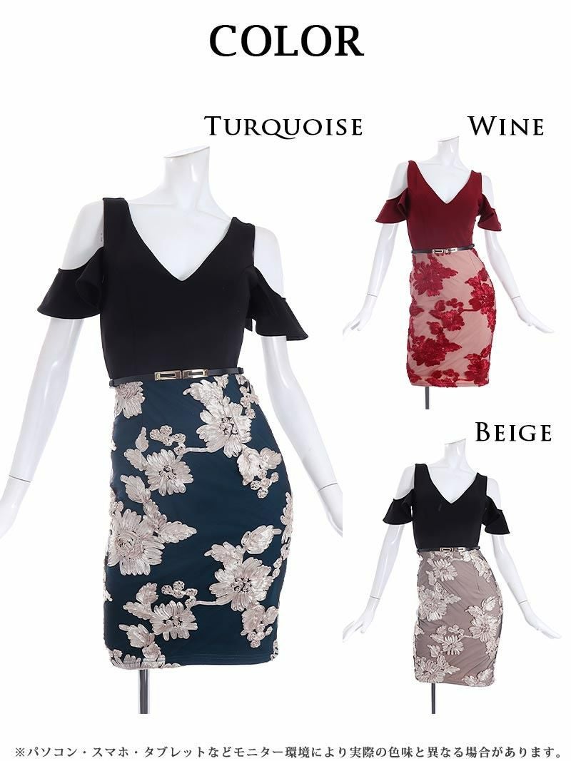 訳あり膝丈ドレス 【訳ありアウトレット】刺繍フラワー袖付き肩魅せミディ丈キャバドレス【Belsia】(S/M/L)(ワイン/ベージュ/ターコイズ)