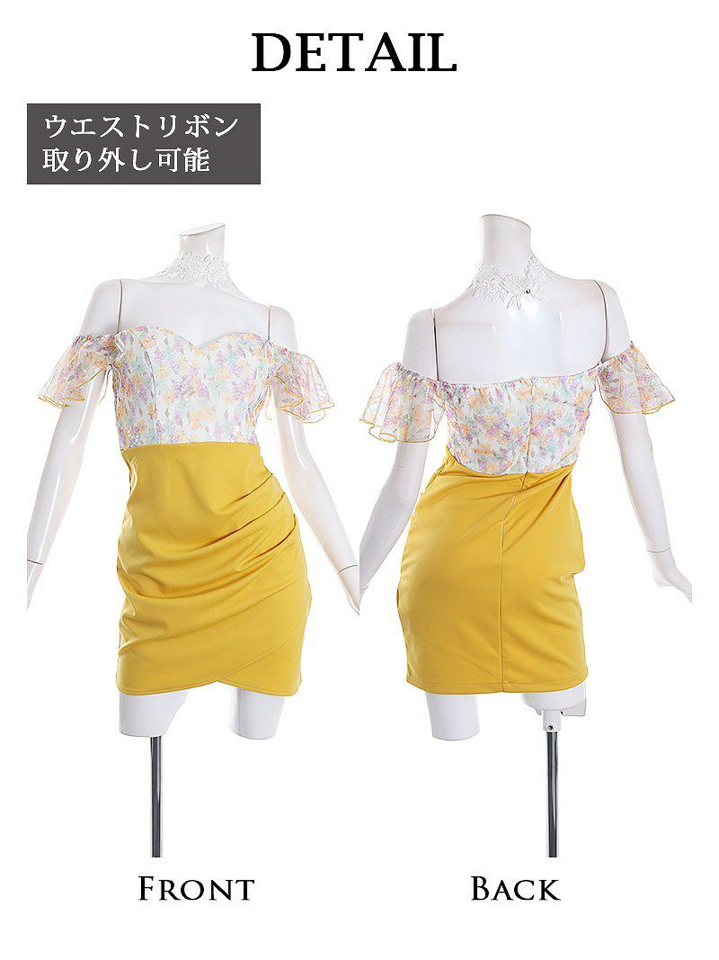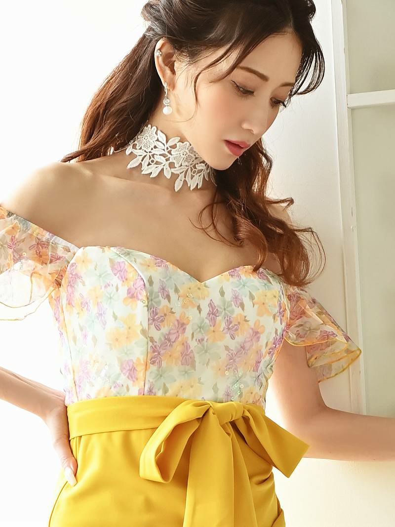 4. 【訳ありアウトレット】豪華オフショルダー小花柄キャバミニドレス【Belsia】(S/M/L)(イエロー/パープル)