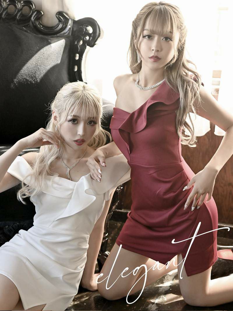 フリルデザインとアシンメトリーなシルエットで、華やかさと上品さを兼ね備えています。