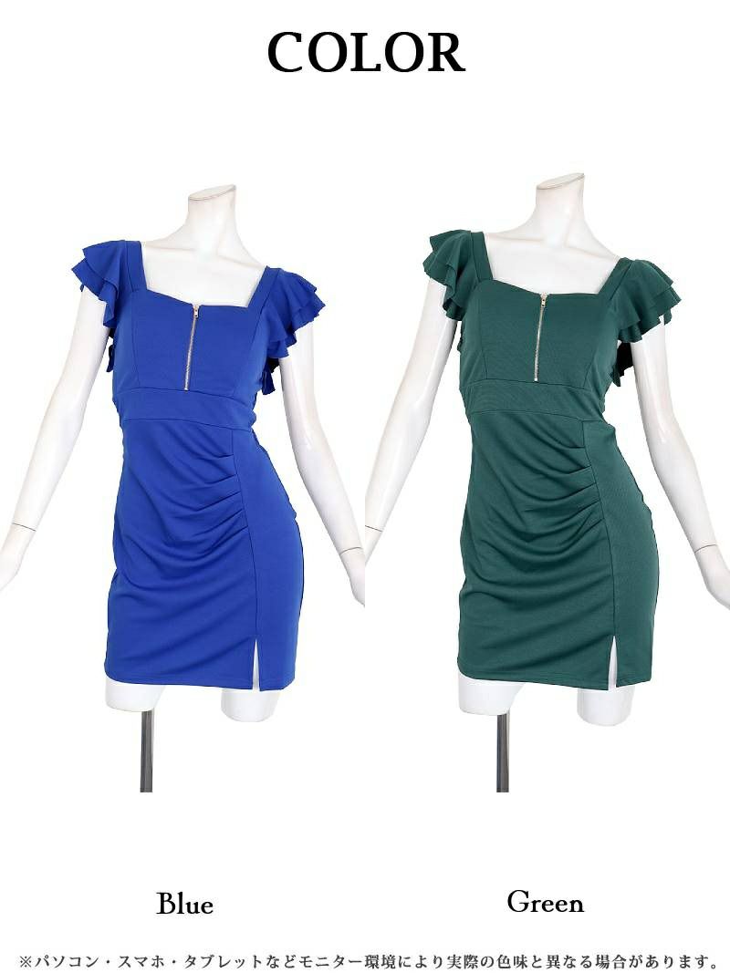 コスパ抜群!激かわドレス 先行予約10%OFF¥2990→¥2691!※予約販売※バストジップフリル袖タイトミニドレス りせり 着用 キャバドレス【RyuyuChick】(S/M/L/XL(2L)/XXL(3L))(グリーン/ブルー)