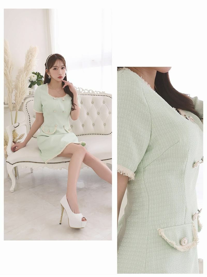 韓国風お嬢様ミニドレス 韓国風ライトツイード袖付きキャバドレス【Ryuyu】(S/M/L)(アイボリー/グリーン)