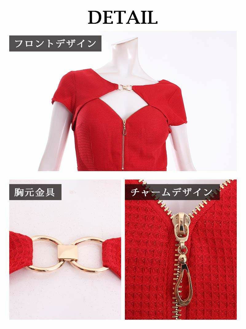 袖付きデザインとハイウエストが美しいシルエットを作り、ゴールドのジップが豪華さをプラス。