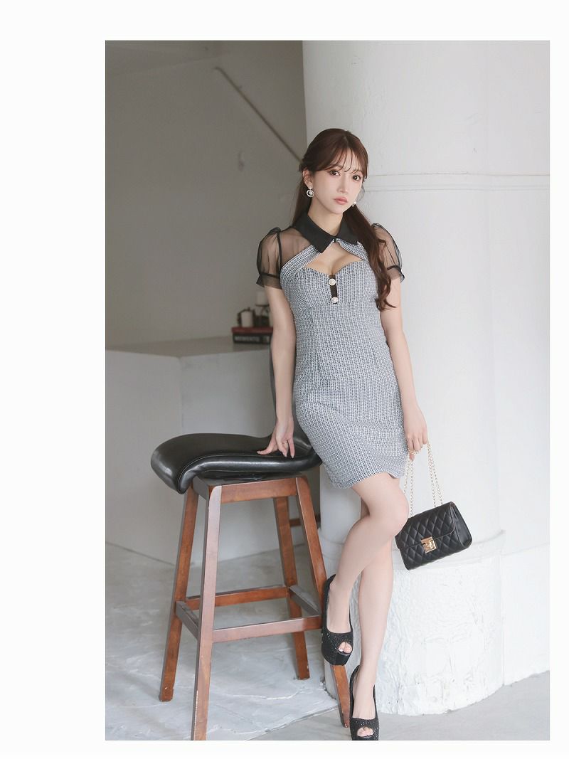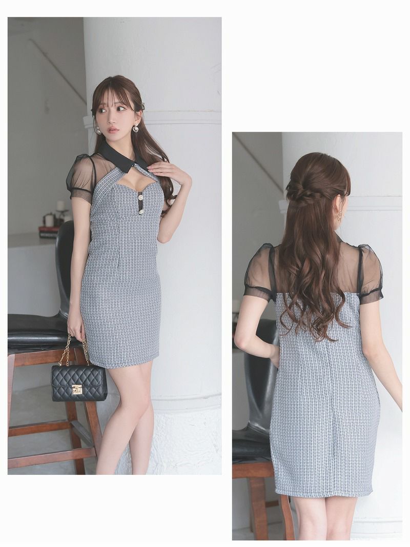 透け感スリーブ袖がドール可愛い半袖キャバドレス。 ツイード×メッシュの異素材ミックスが新鮮! 襟付きデザインで清楚だけど色気もしっかりな胸盛りドレス。 美シルエットを叶えるタイトなミニドレス。 キャバ嬢必見!肌見せバランスがちょうどいいキャバワンピ。