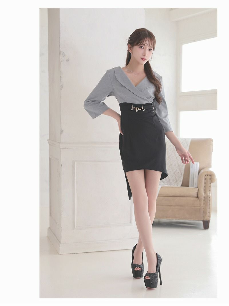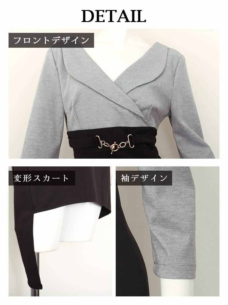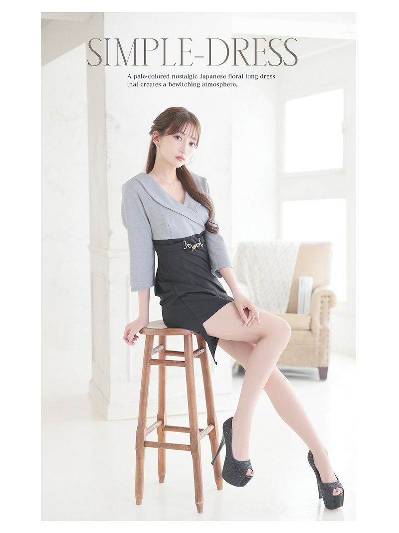 バイカラー×グレーの落ち着いた色合いに、襟付き&七分袖でしっかりきちんと感を演出できるキャバドレスです。