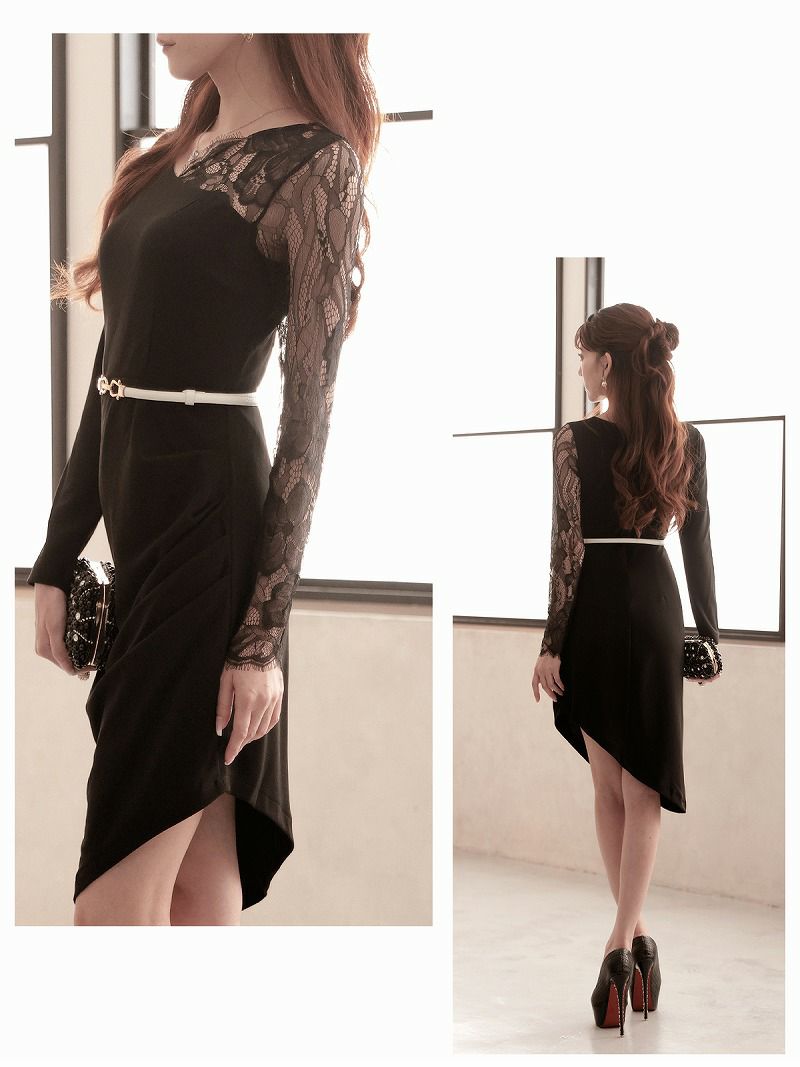 5. アシンメトリーレーススリーブ膝丈キャバドレス 加賀美早紀 着用 キャバドレス【Belsia】(S/M/L/XL(2L))(ブラック)